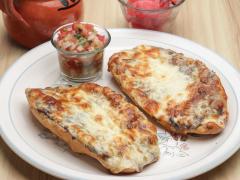 Pan bolillo cubierto de una capa de frijoles, gratinado con queso manchego (2 piezas) acompañado con pico de gallo (jitomate, cebolla y chile verde).