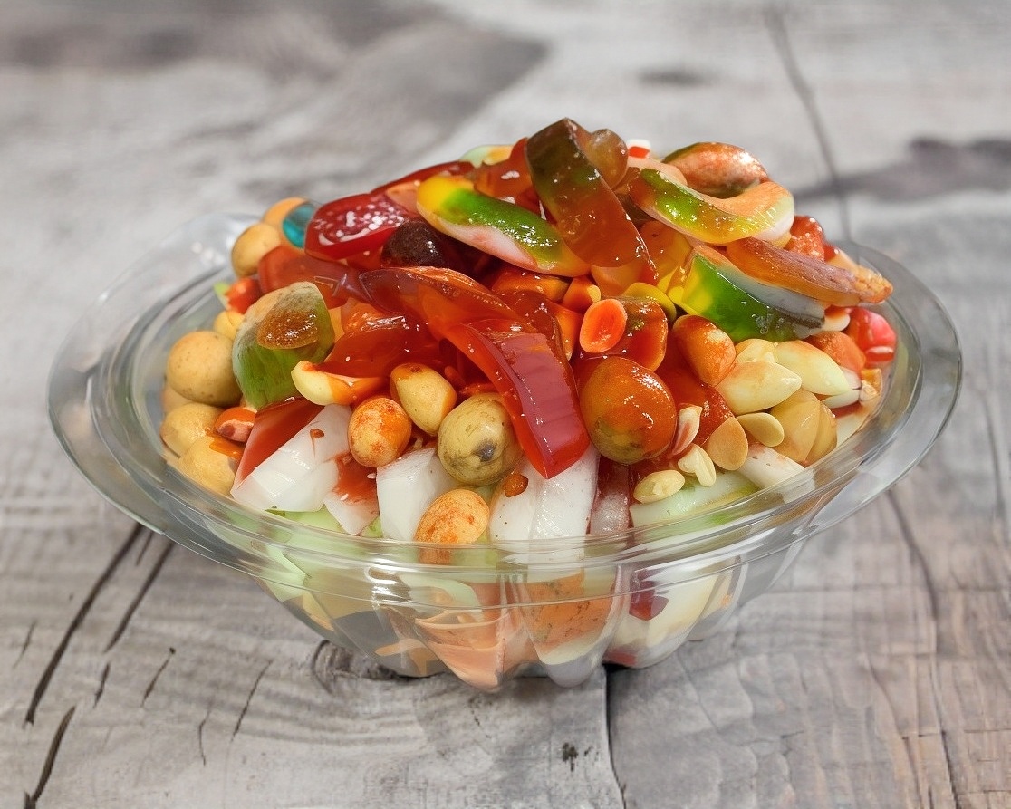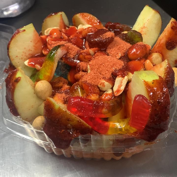 Manzana cubierta con chamoy, jicama, zanahoria, pepino, gomitas, cacahuates, chamoy, botanera y miguelito