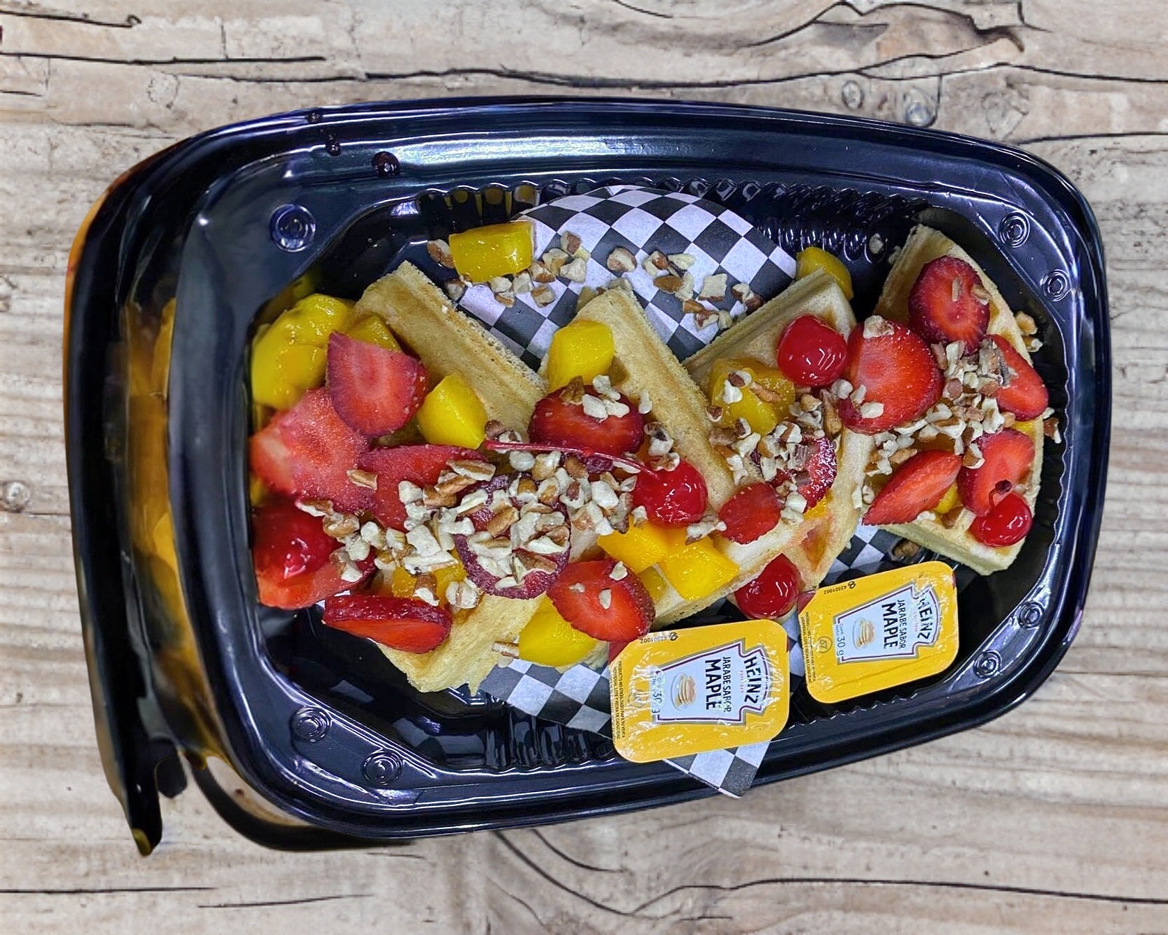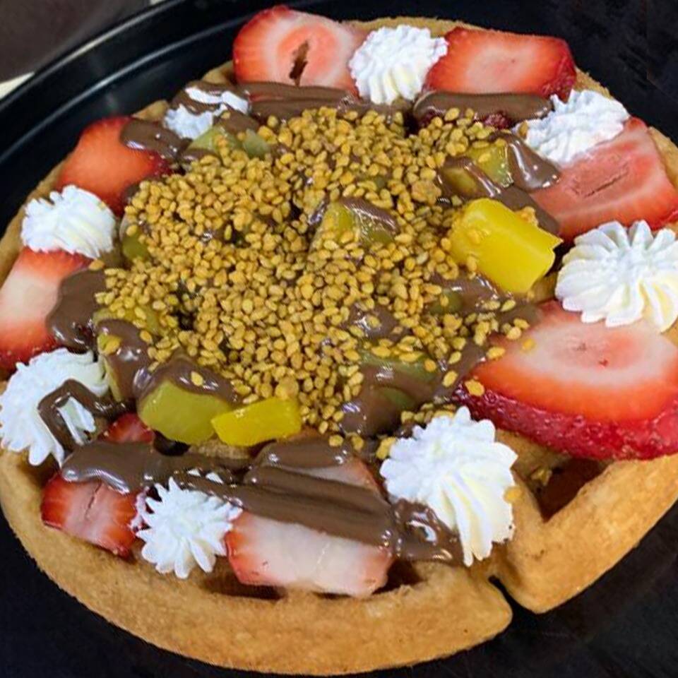 Waffle acompañado de durazno, plátano, manzana, nuez, arandano y elige tu complemento