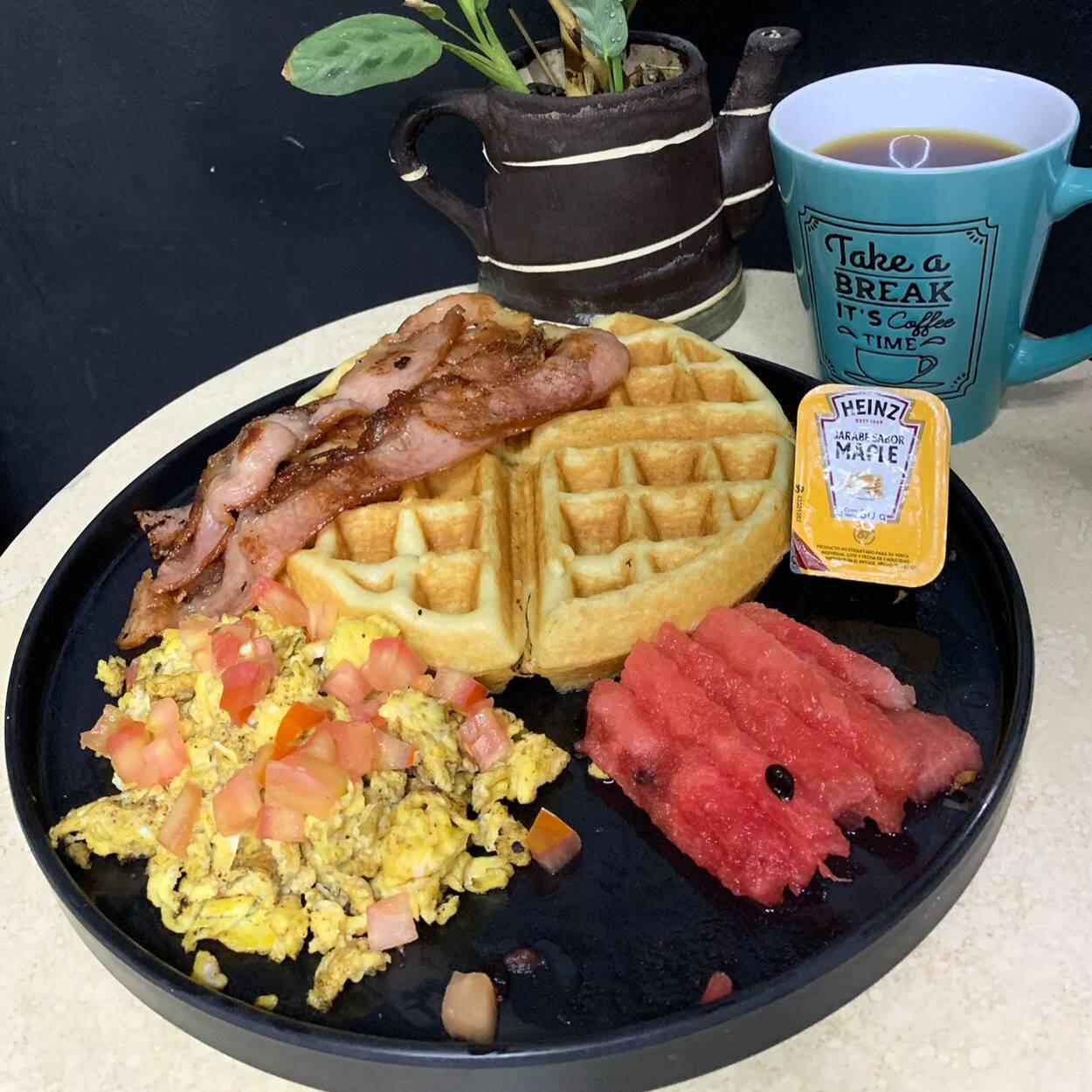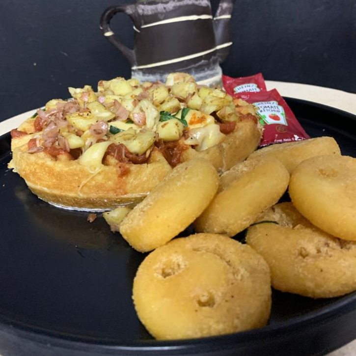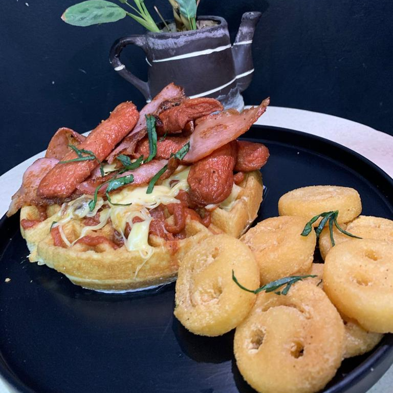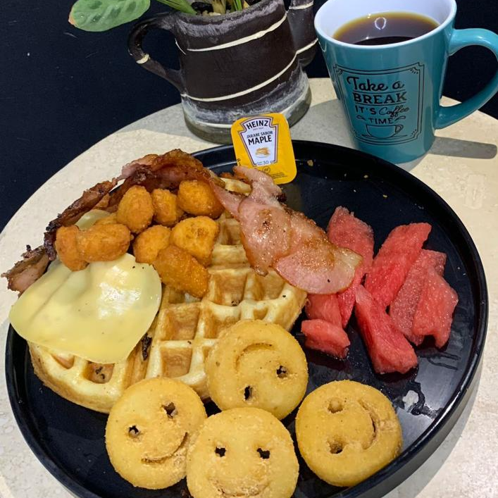 Waffle con salsa italiana, salchicha, tocino y queso manchego, acompañados de papas a la francesa, te y fruta de la estación
