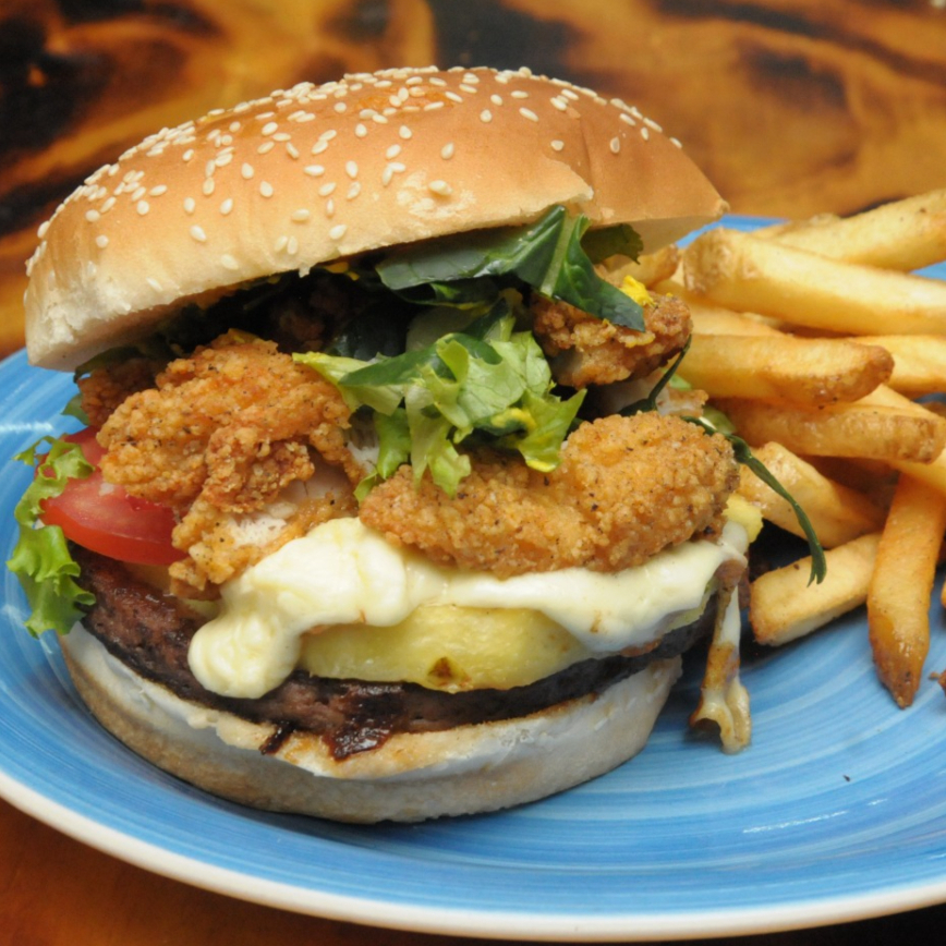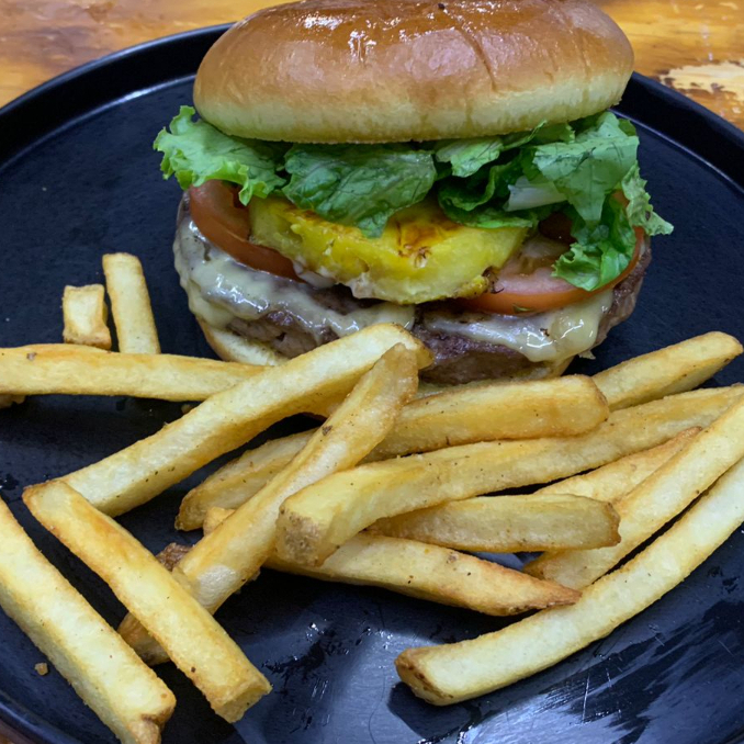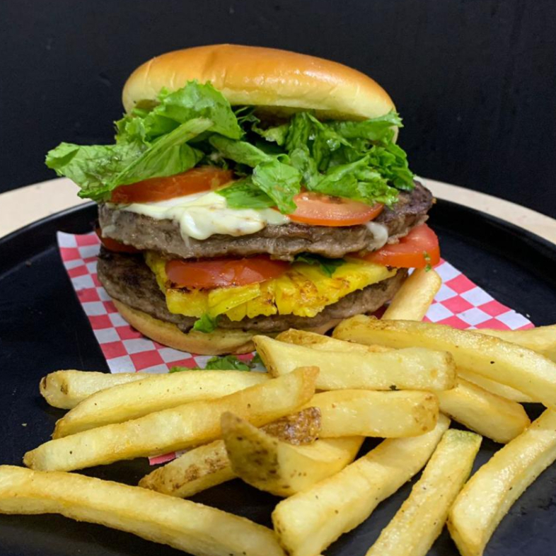Deliciosa combinación de carne de arrachera, piña, tocino, salchicha, jamón, lechuga, jitomate, queso manchego acompañado de papas a la francesa