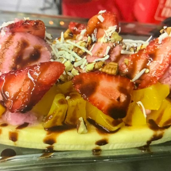 Base de plátano, con 3 bolas de helado, elige fruta y complementos