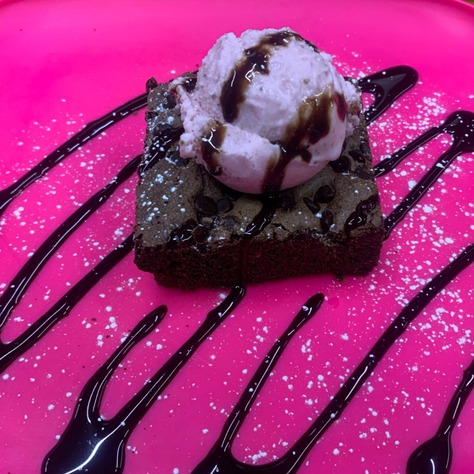 Delicioso brownie, acompañado de helado y fruta de tu elección