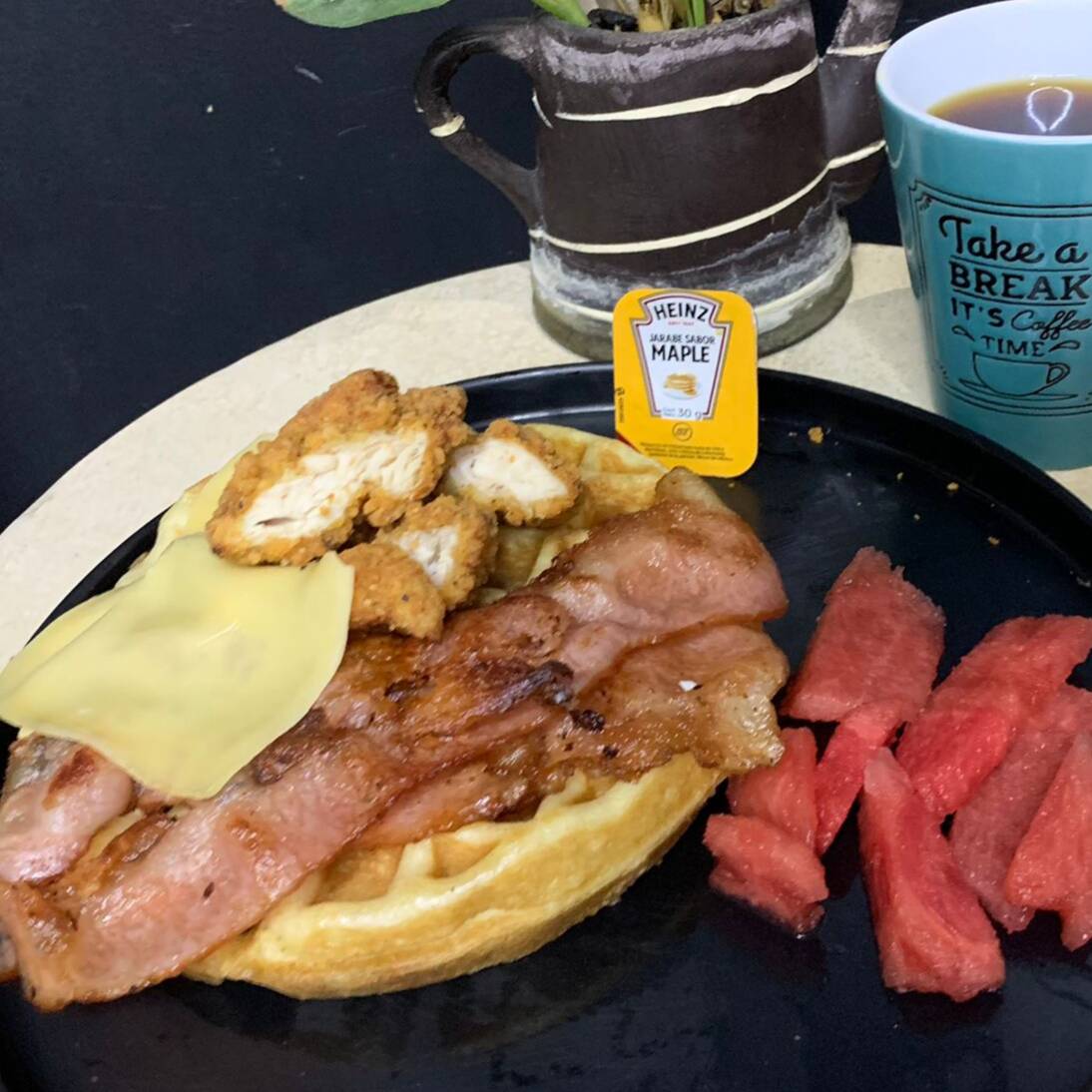 Waffle con palomitas de pollo, tocino, manchego, papas a la francesa, fruta de la estación, te y maple