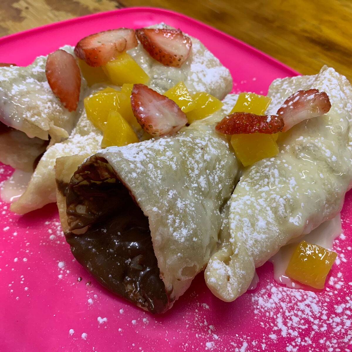 Buñuelos en forma de cono, rellenos de fruta y topping de tu elección