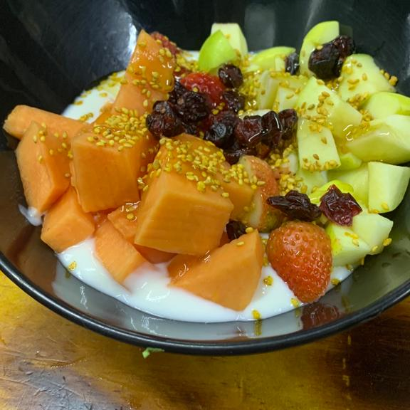 Yogurt natural adicionado con frutas, semilla y topping