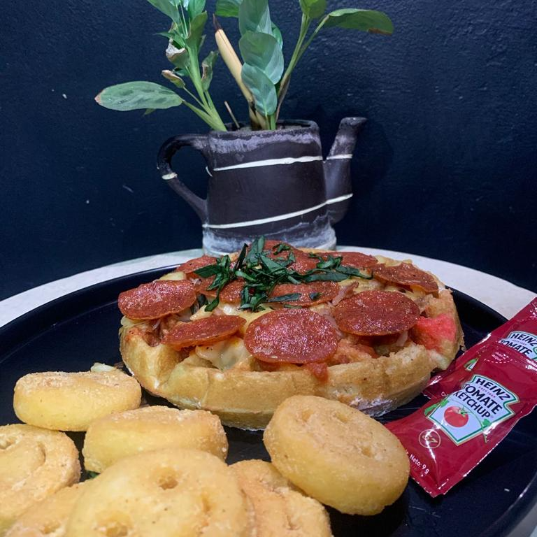 Waffle con salsa italiana, peperoni y queso manchego, acompañado de papas a la francesa, te y fruta de la estación