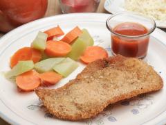 Pechuga empanizada acompañada con verduras al vapor o ensalada.
