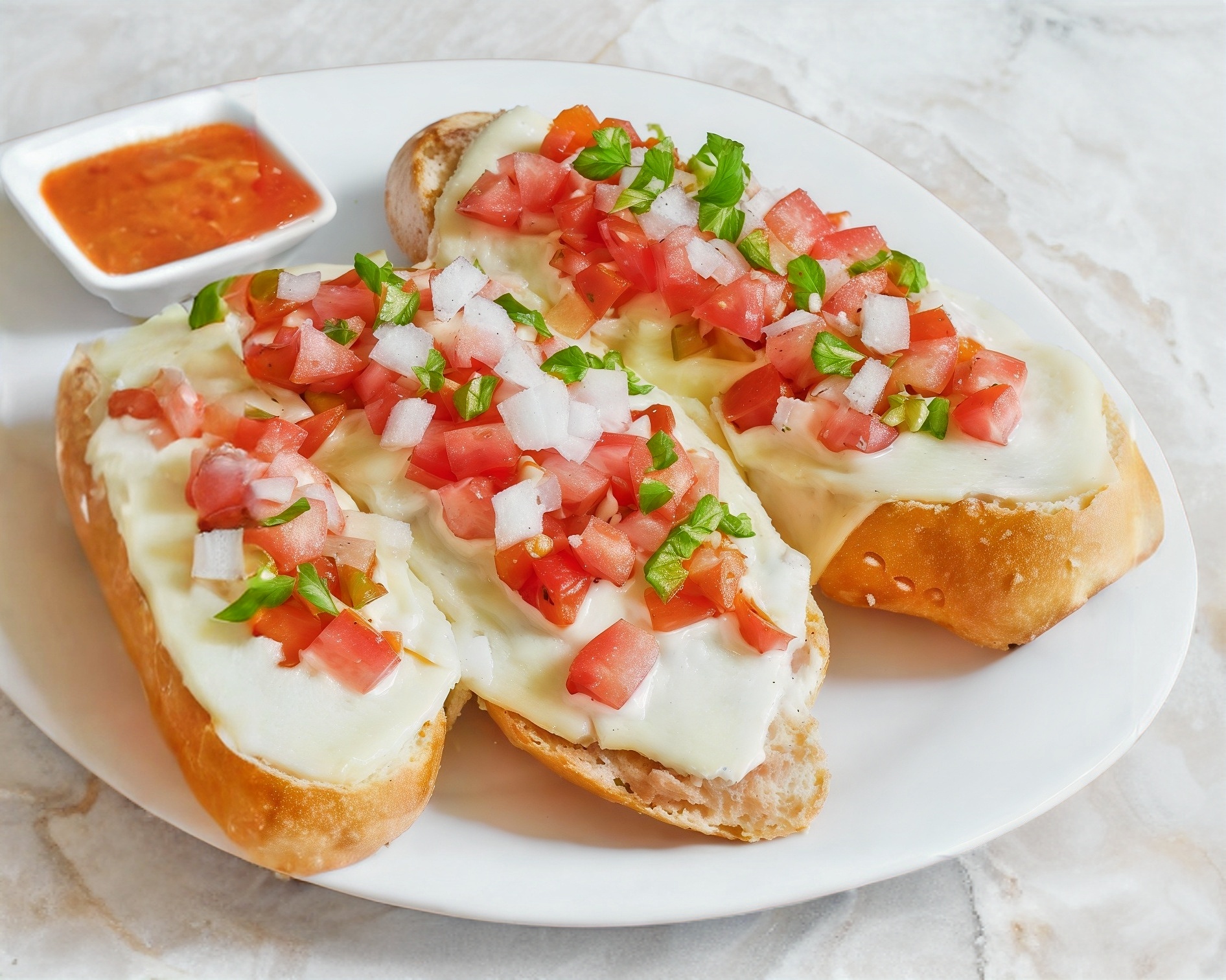 3 Molletes con frijoles bayos refritos, acompañados de pico de gallo.