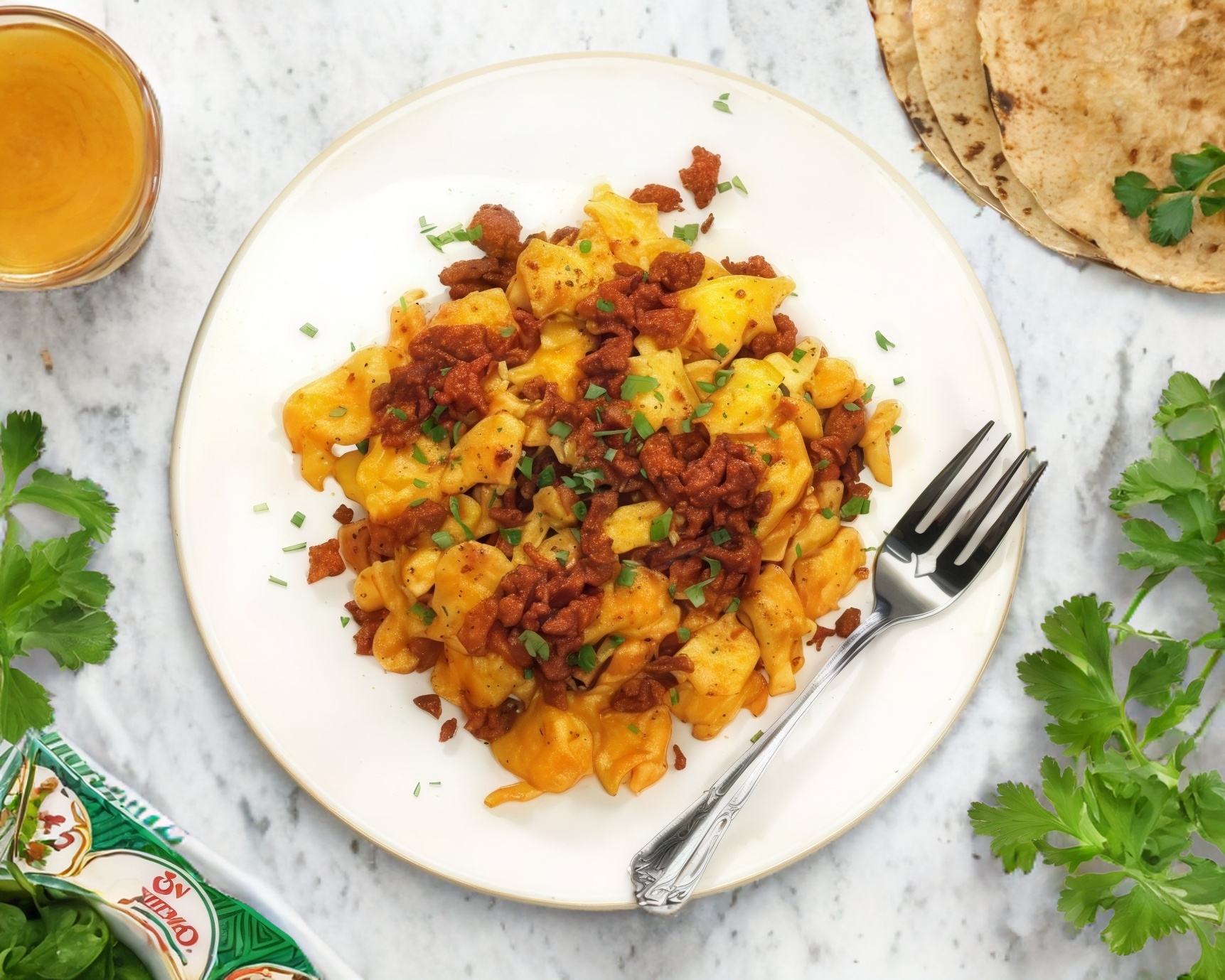 3 Huevos revueltos o estrellados, acompañados de chorizo y 3 tortillas o un bolillo más salsa de la casa.