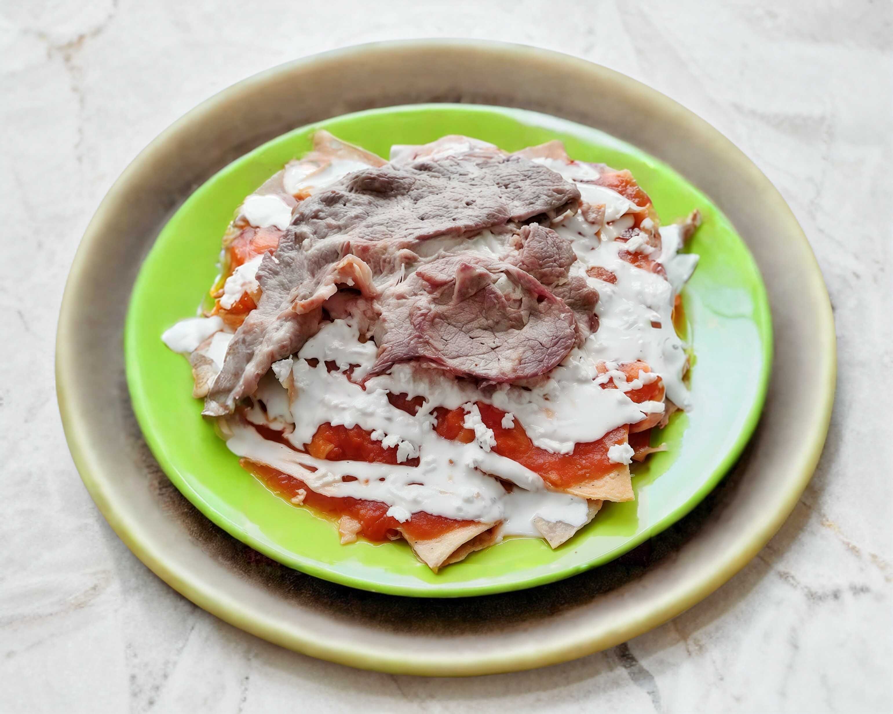 Verdes o rojos con salsa de la casa, bistec, acompañadas de crema, queso panela y cebolla más un bolillo.