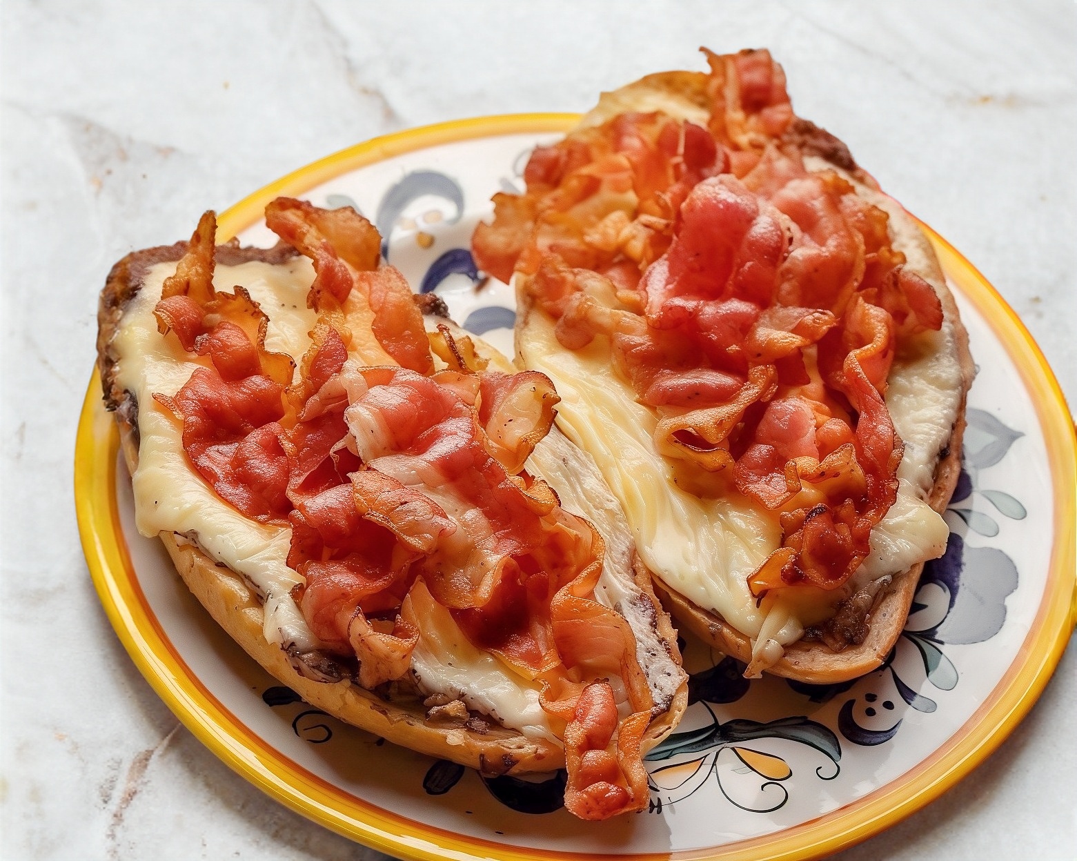 3 Molletes con tocino con frijoles bayos refritos, acompañados de pico de gallo.