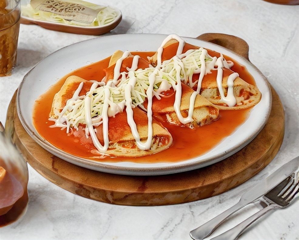 Orden de 4 enfrijoladas, acompañadas de queso rayado, crema y bolillo