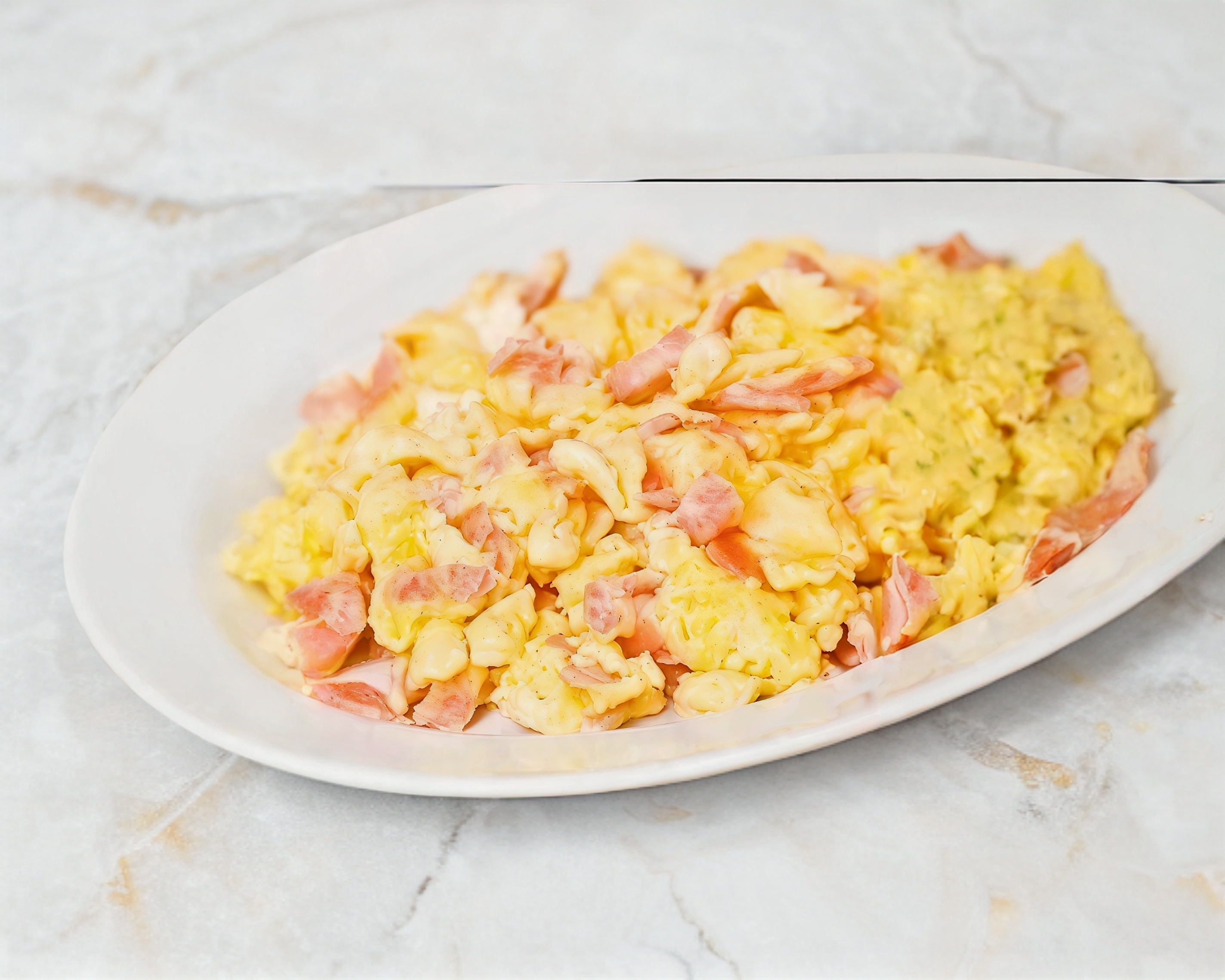 3 Huevos revueltos o estrellados, acompañados de jamón y 3 tortillas o un bolillo más salsa de la casa.