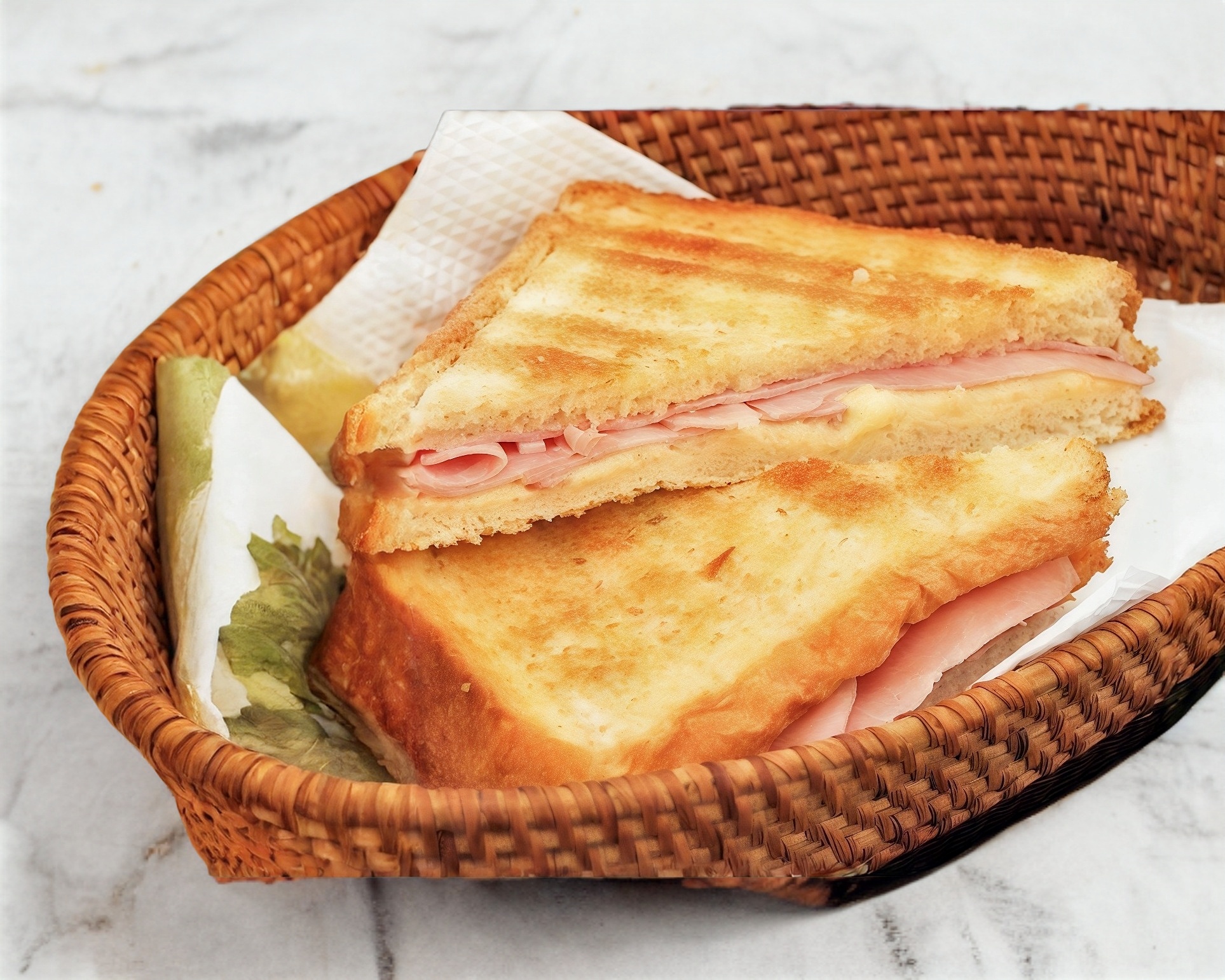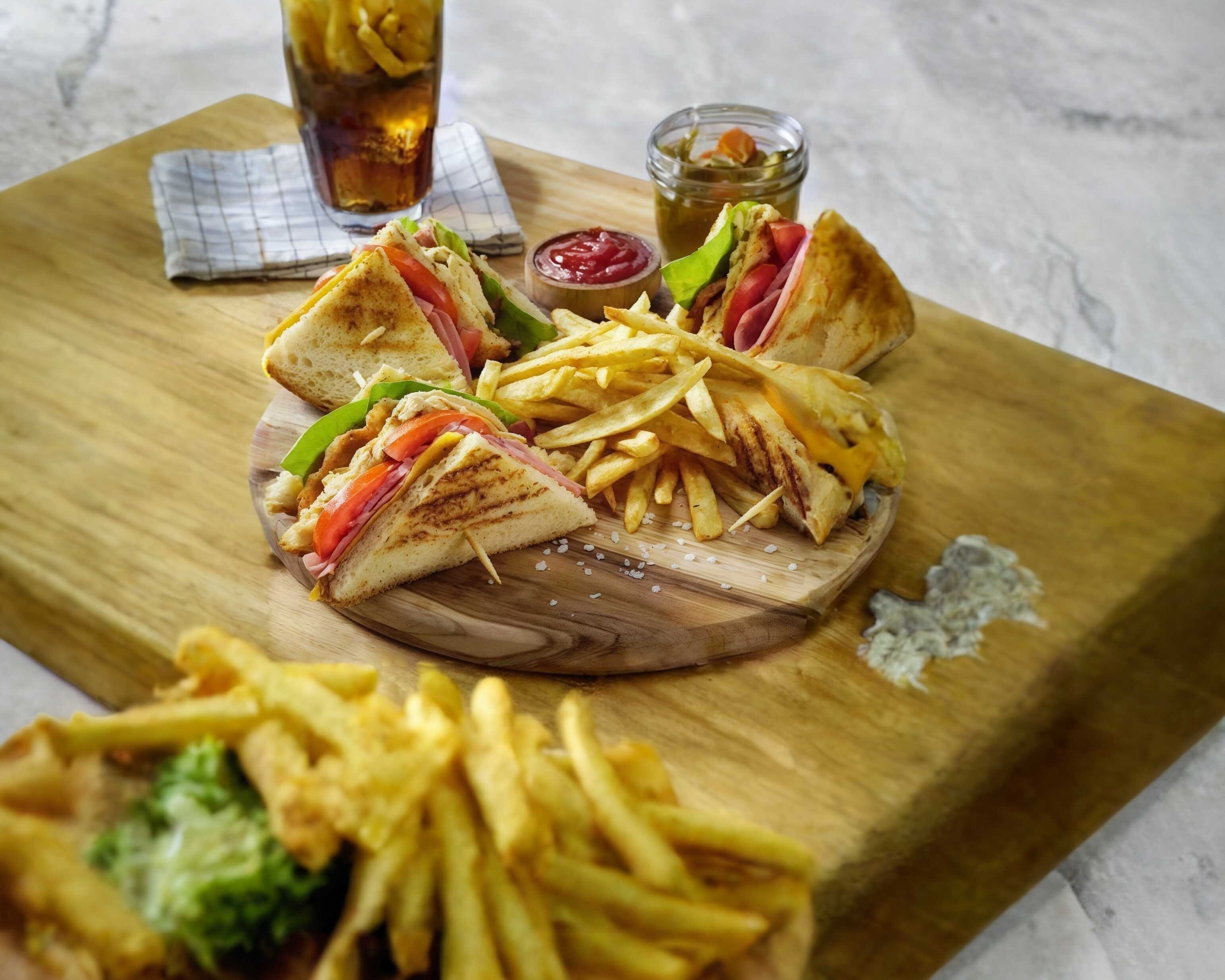 Sándwich de 3 pisos con jamón de pechuga ahumada (25 gramos), jamón de pierna, queso manchego, queso amarillo, lechuga, tomate y aderezo de la casa, acompañado de papas a la francesa 1 porción.