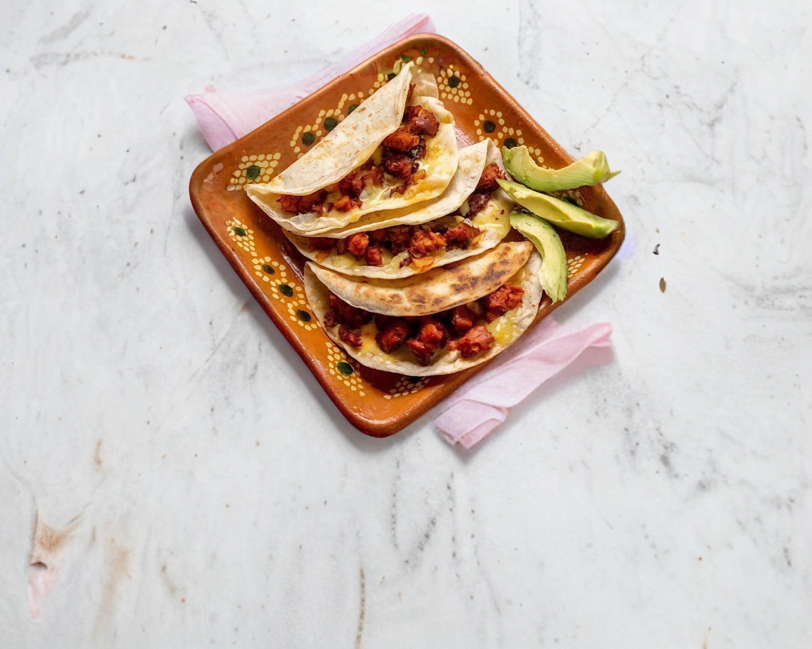 Platillo personal, 3 quesadillas con tortilla de harina ó maíz con queso a elegir. 35 Gramos cada una más pico de gallo.
