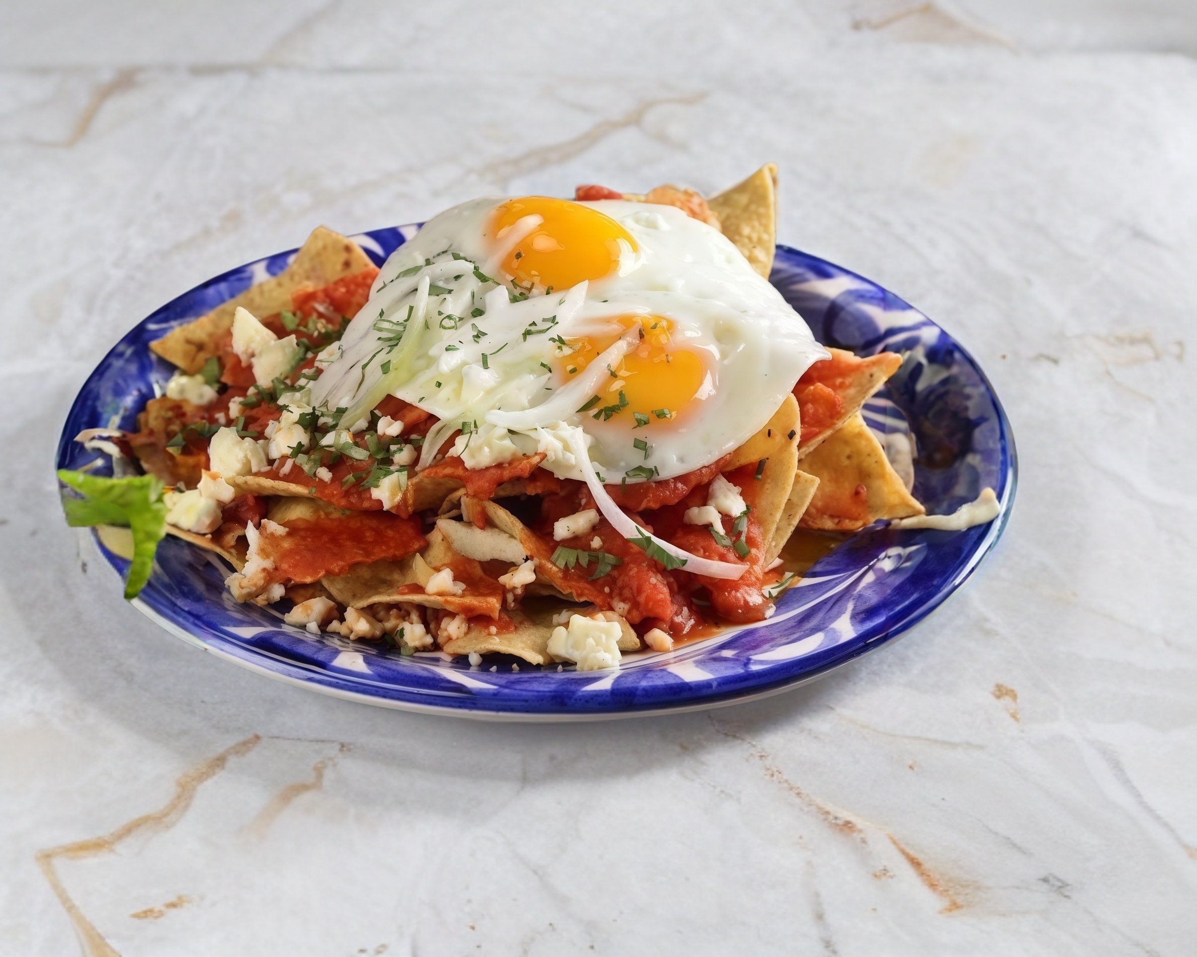 Verdes o rojos con salsa de la casa, huevo, acompañadas de crema, queso panela y cebolla más un bolillo.