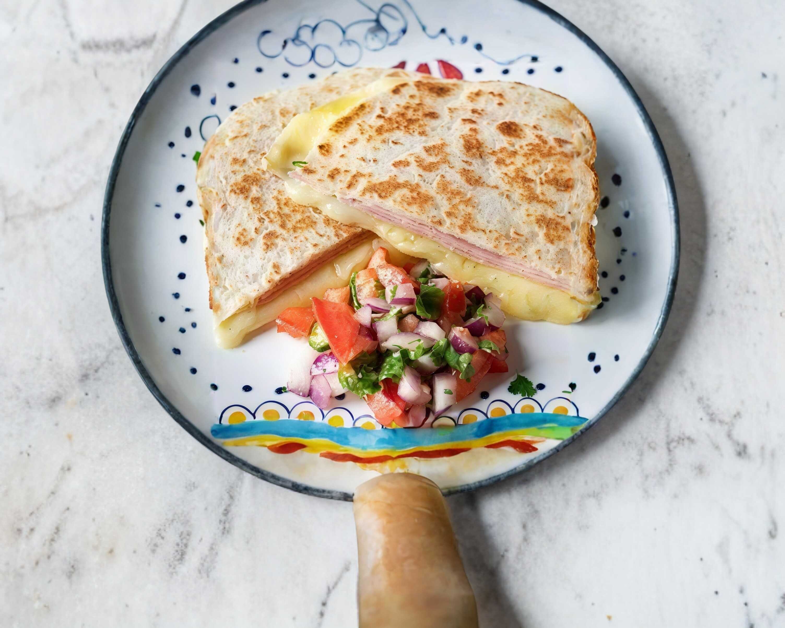 3 Sincronizadas con tortilla de harina o maíz con queso a elegir manchego u Oaxaca y chorizo.