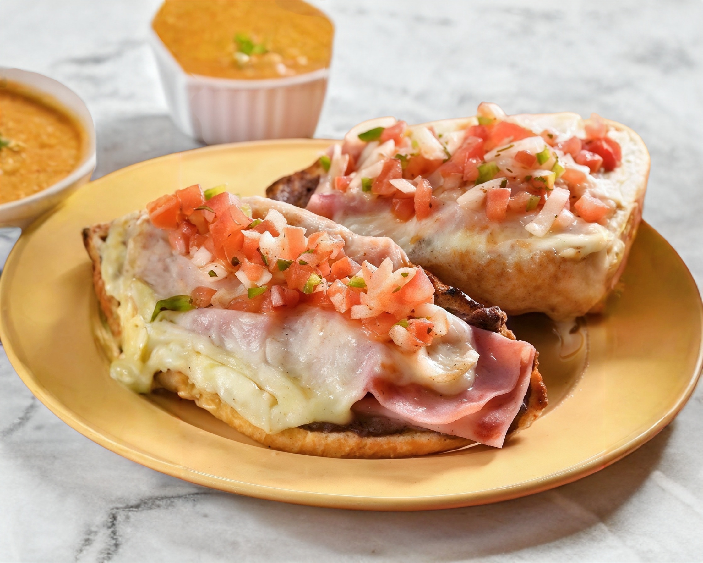 3 Molletes con jamón, frijoles bayos refritos, acompañados de pico de gallo.