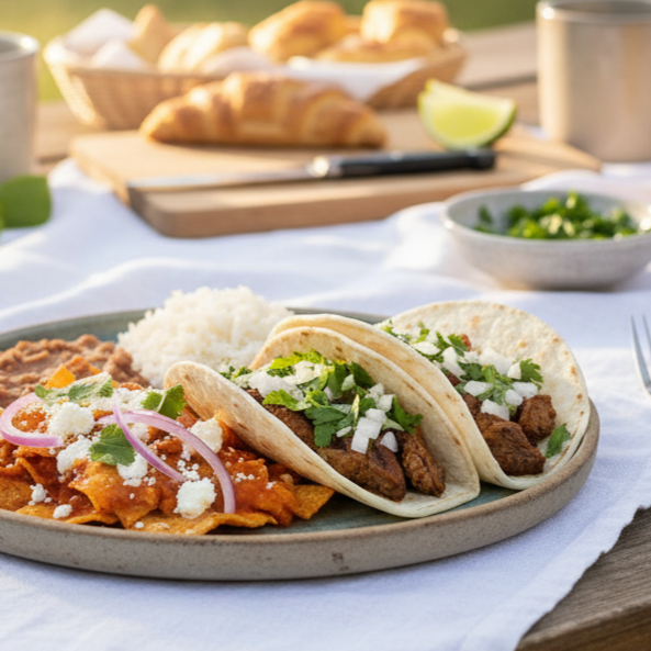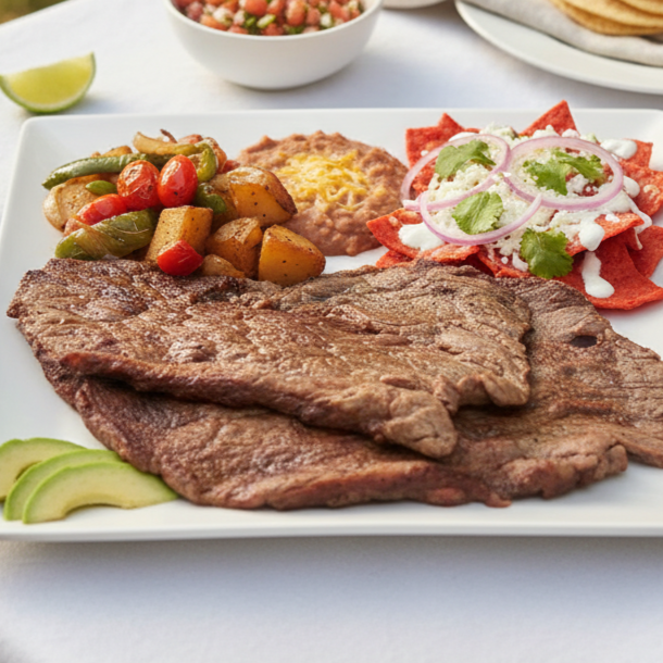Bistec asado acompañado de arroz o frijoles y chilaquiles