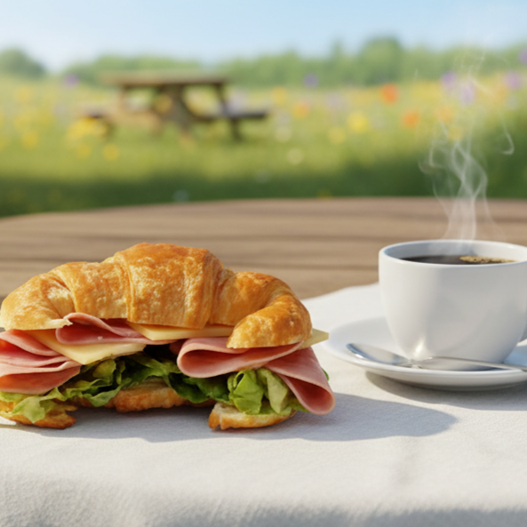 De jamón y queso manchego, incluye fruta del día (a discreción del restaurante) y café.