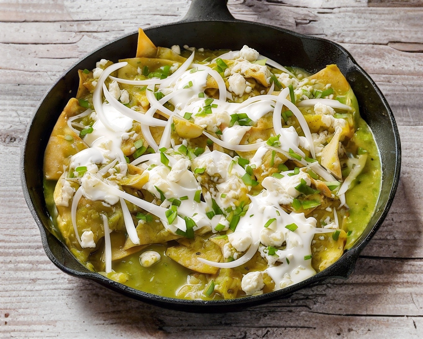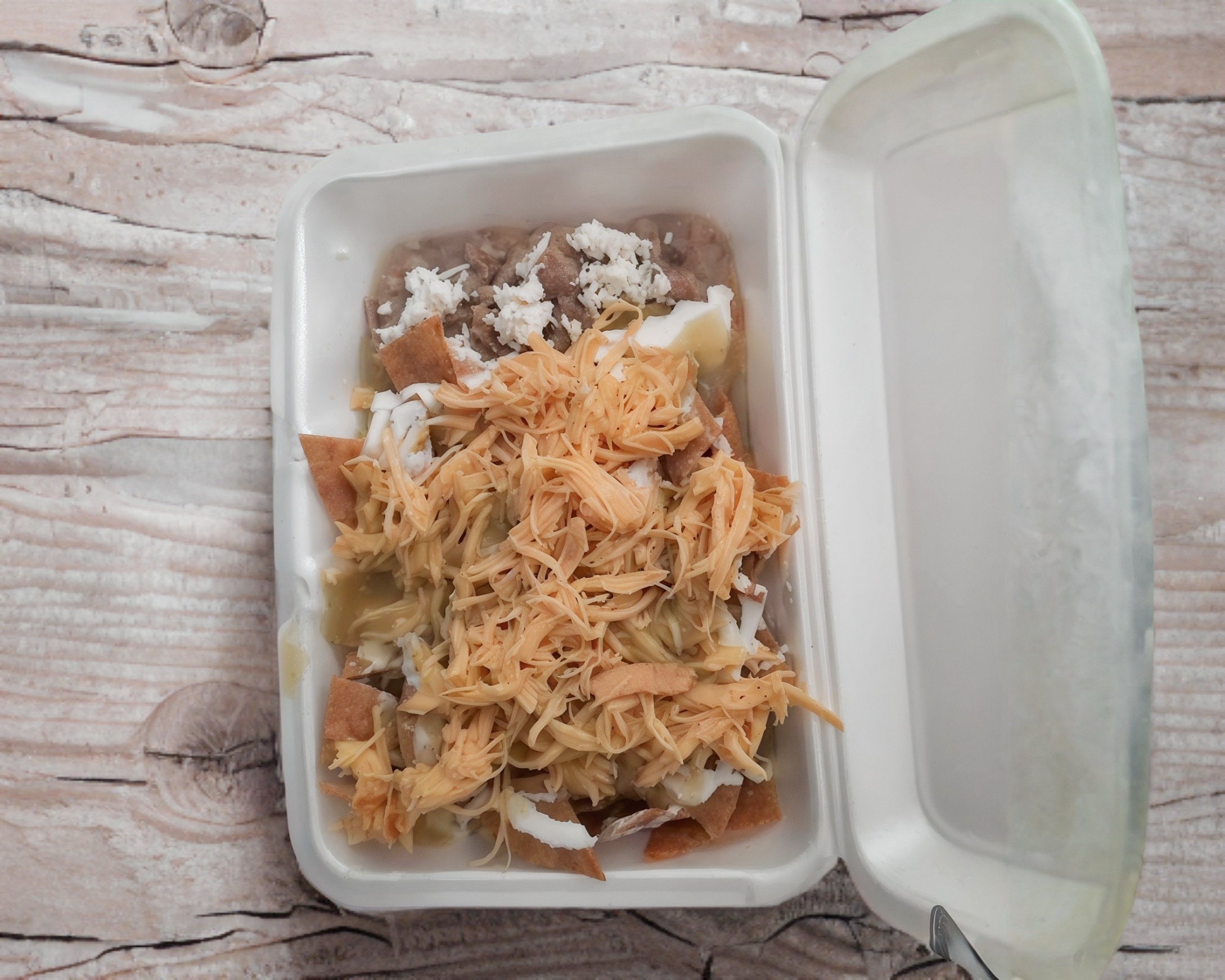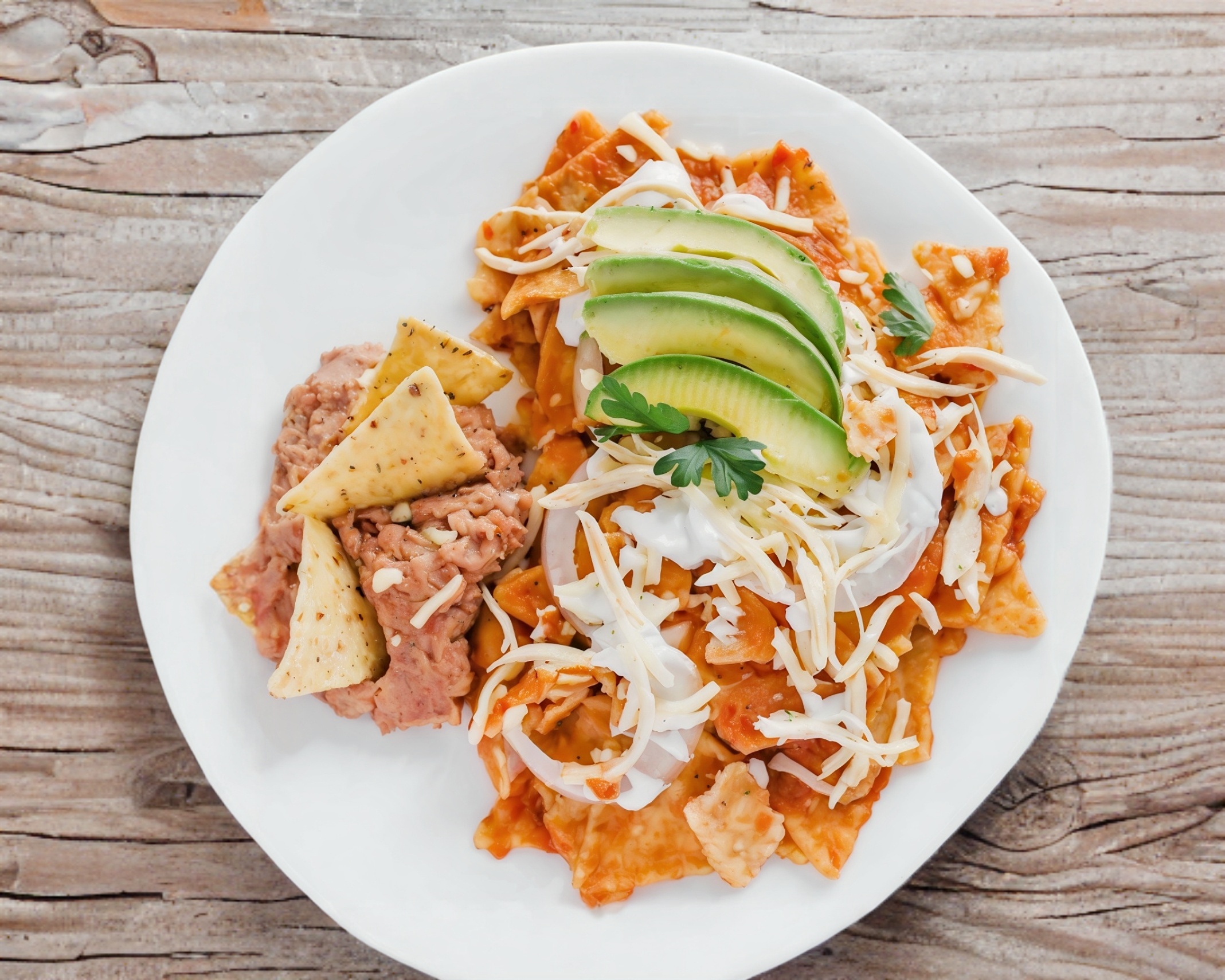 Chilaquiles con bisteck, crema, queso y una porción de frijoles refritos