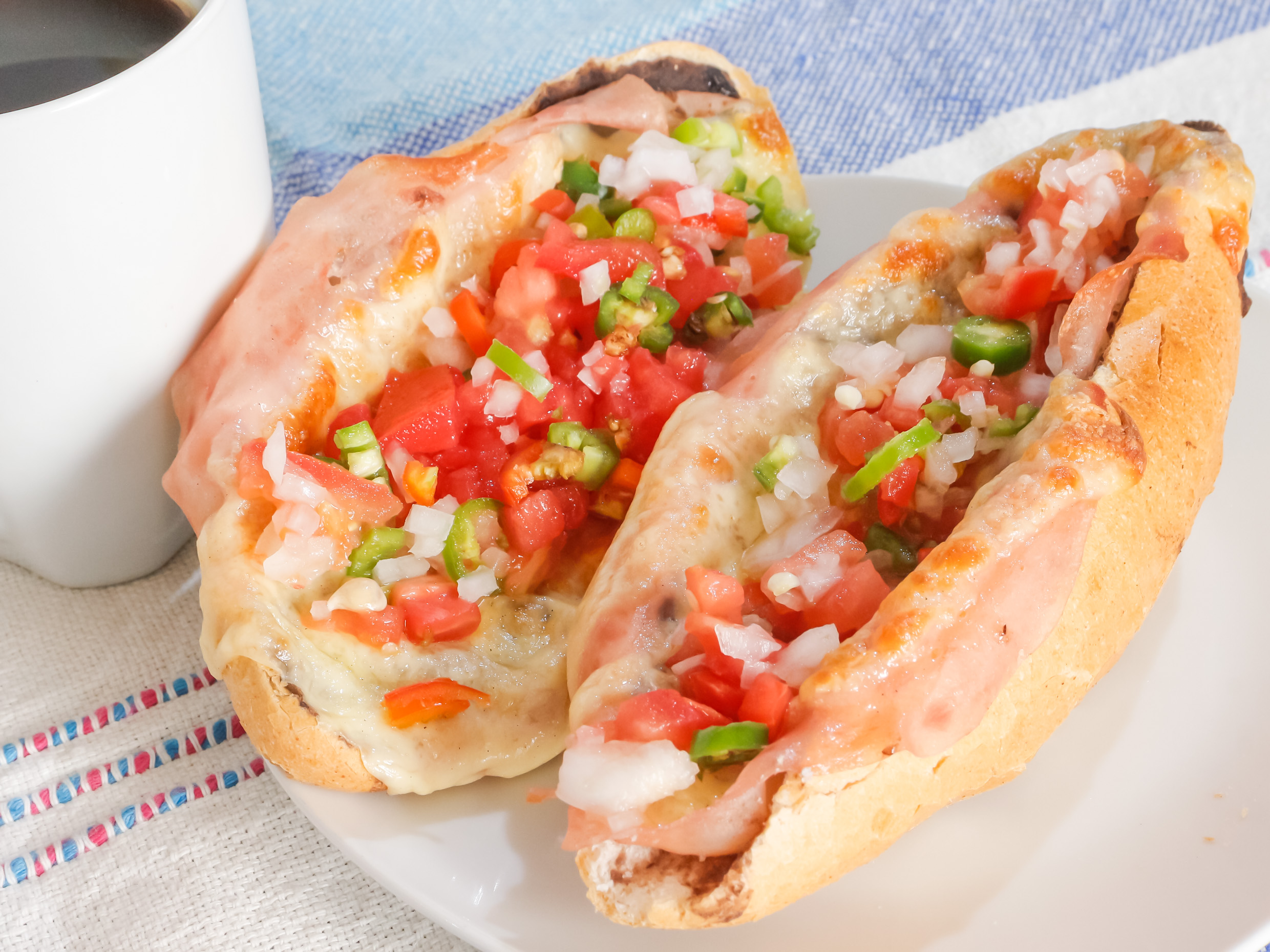 Molletes con frijoles, jamón, queso manchego, longaniza y pico de gallo.