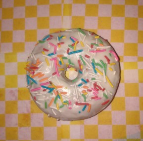 Con granillo de colores y una cobertura de fresa.
