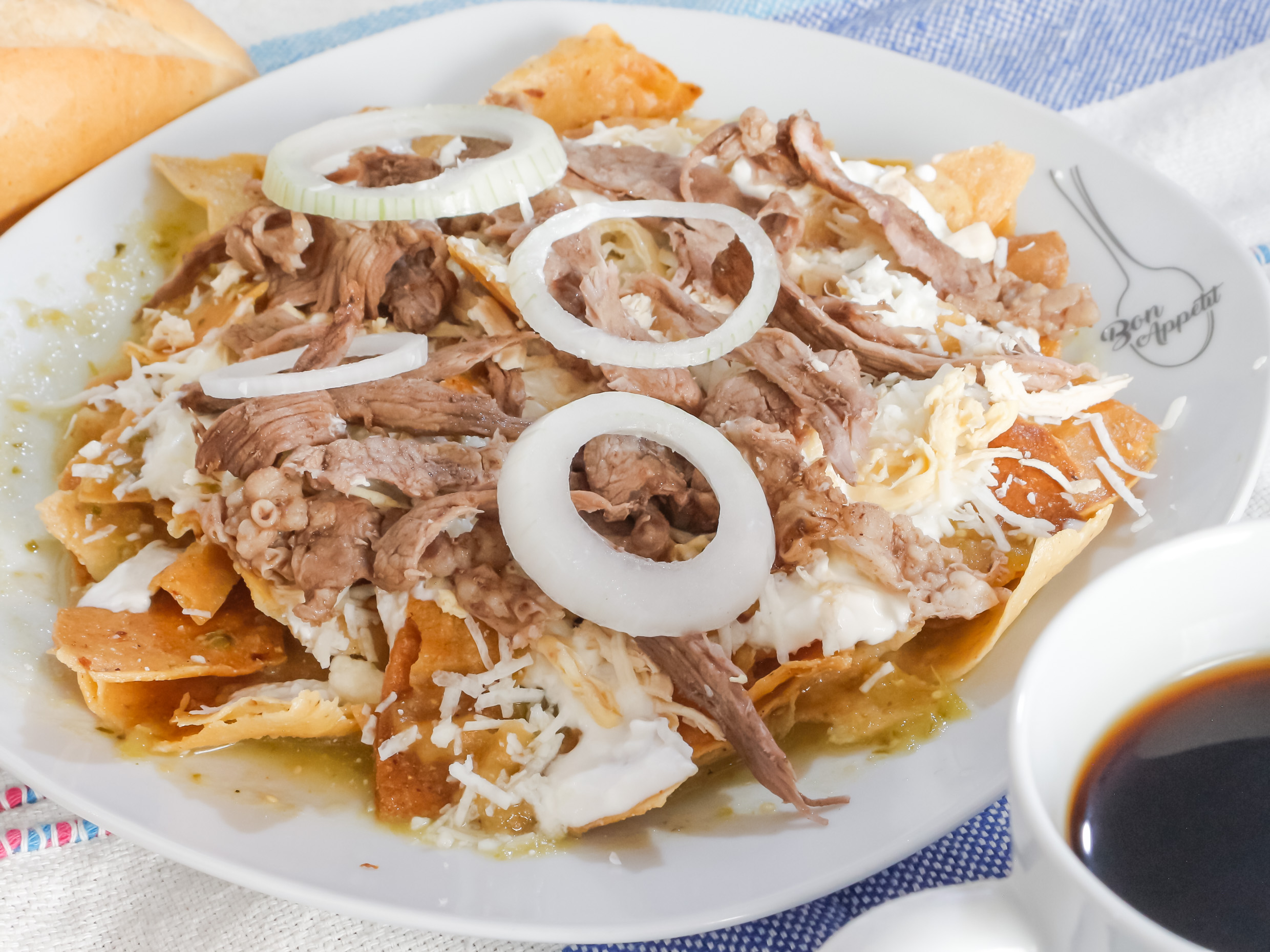 Chilaquiles verdes o rojos con bistec y longaniza, adicional llevan café y pan Gratis