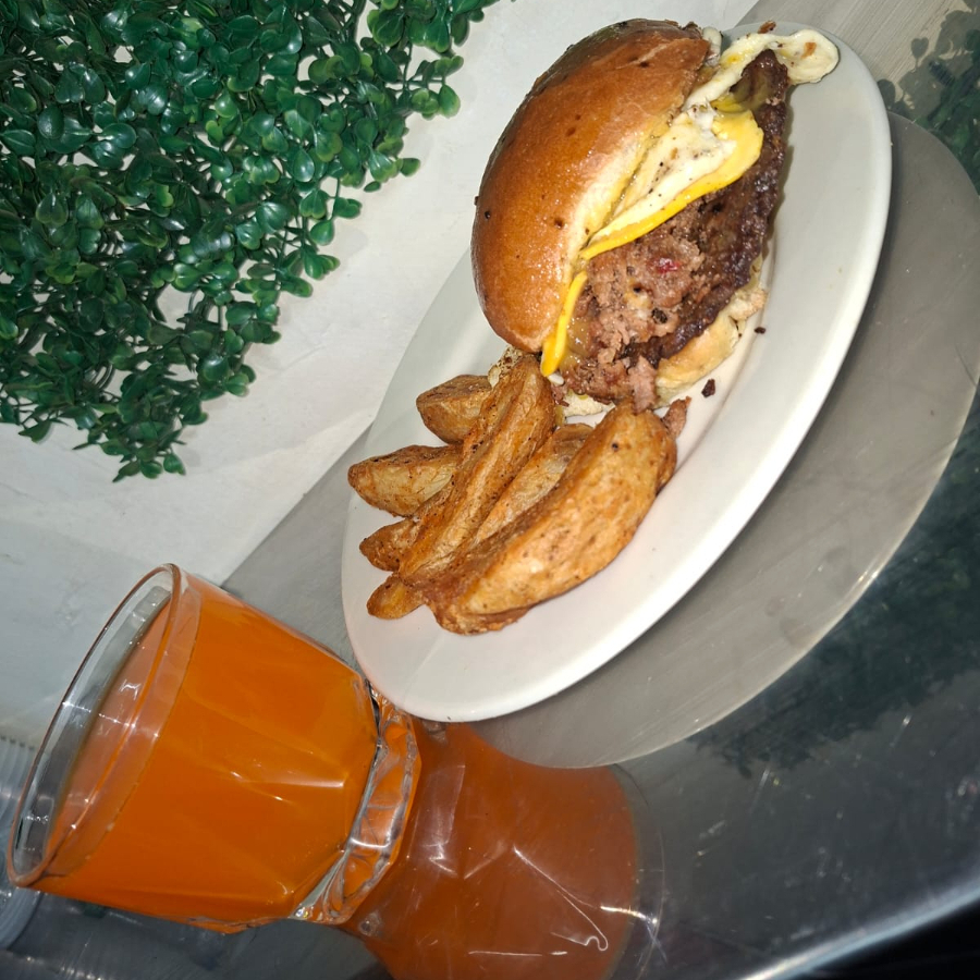 La mejor combinación! Hamburguesa carnosa, como nos gusta! mezcla de quesitos porción de papas gajo y un refresquito!