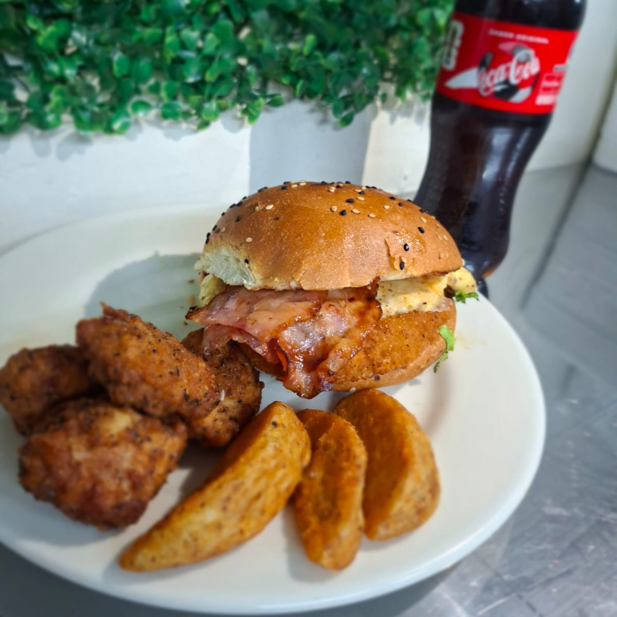 Hamburguesa de pollo + Queso + tocino! No salives, pidela ya 🤤 Adicional papitas gajo y 3 boneless pimienta/limón Una D E L I C I A!
