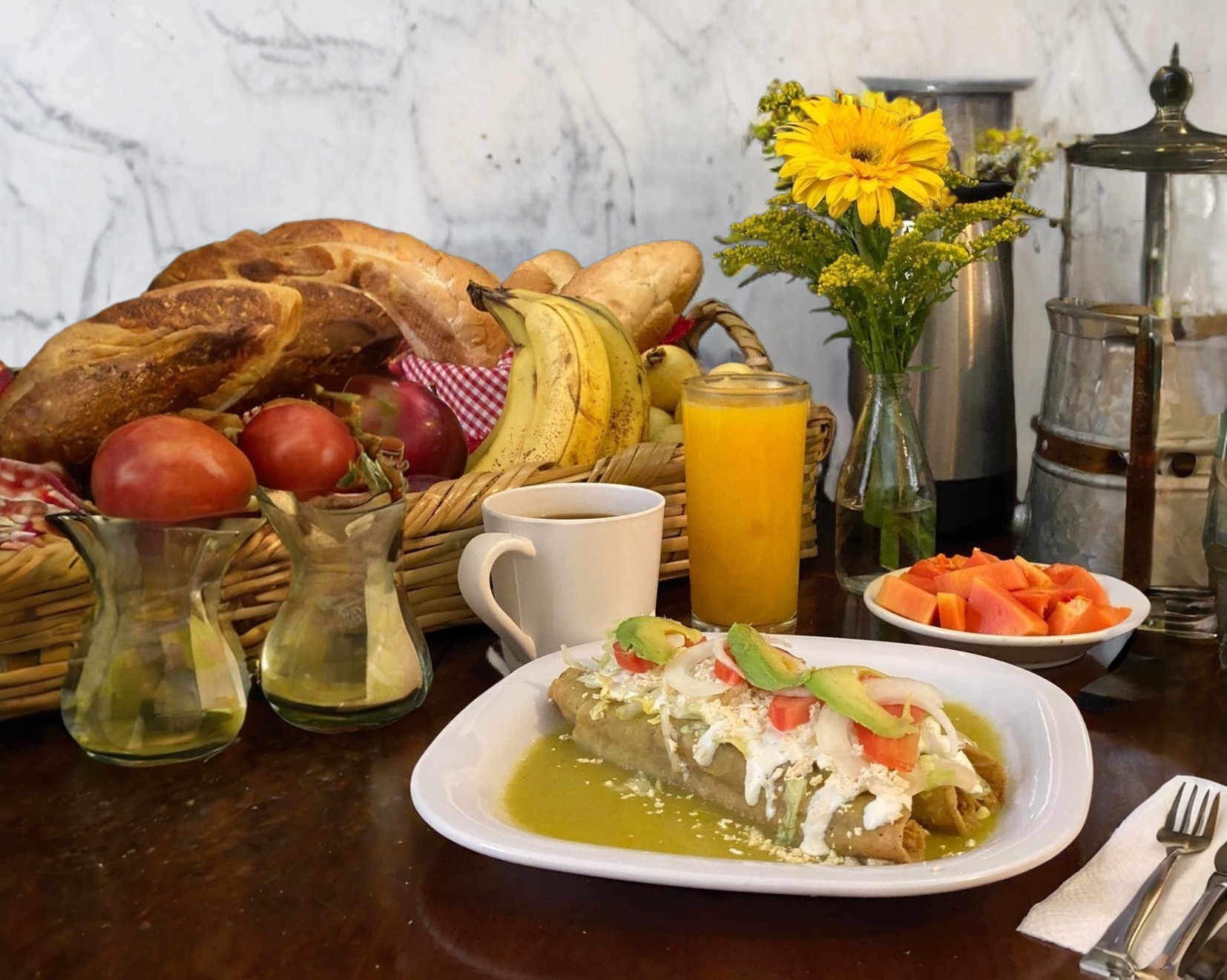 Jugo*1 + Flautas Ahogadas*1 + Fruta*1 + Café*1