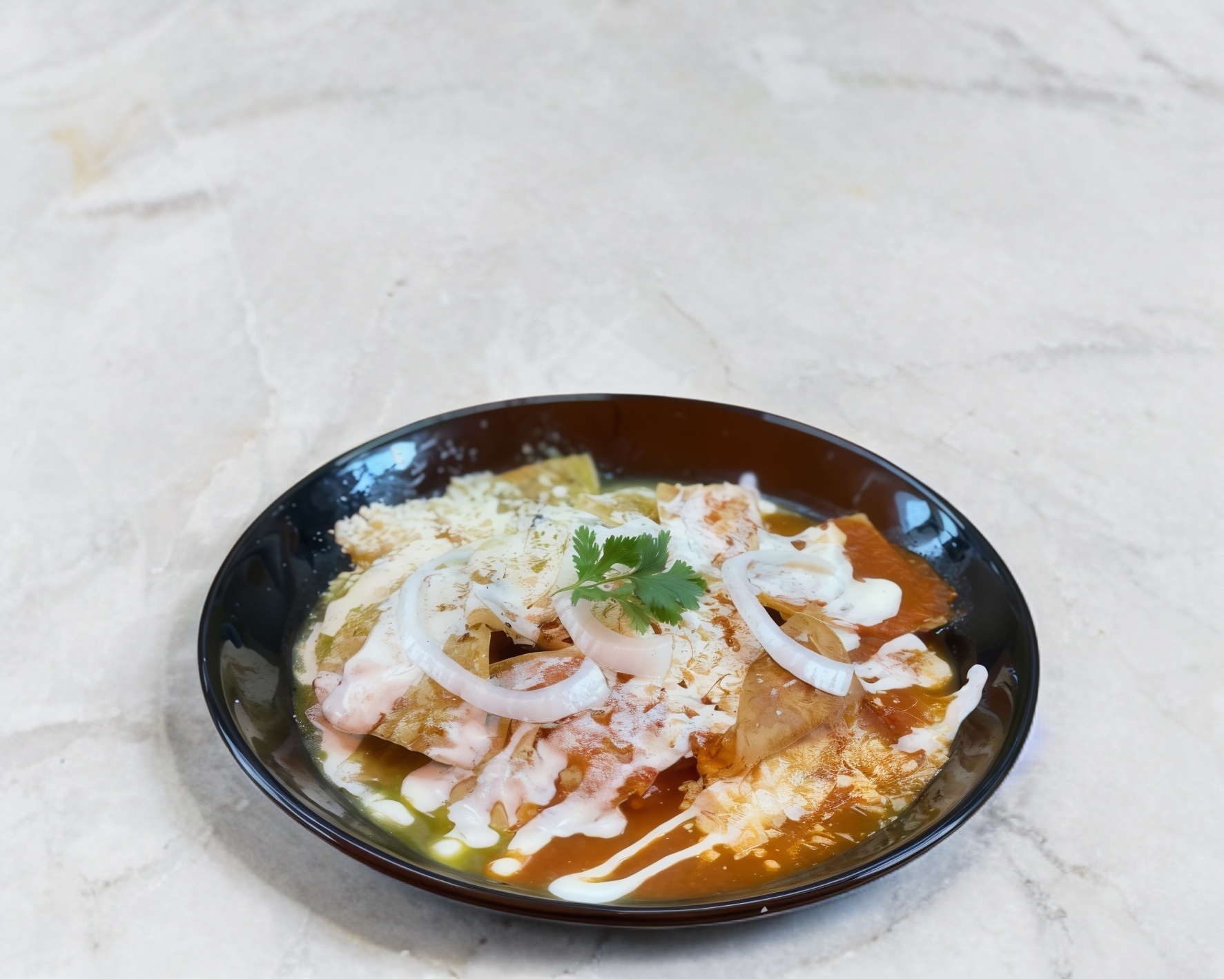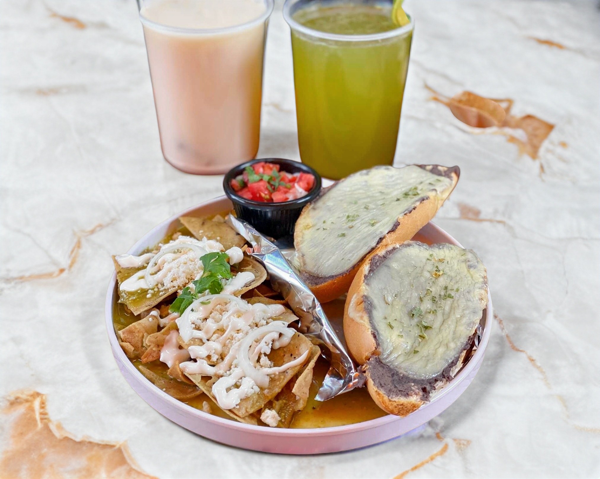 Deliciosos chilaquiles acompañados de queso rayado, crema, cebolla y un bolillito. Elige tu salsa preferida