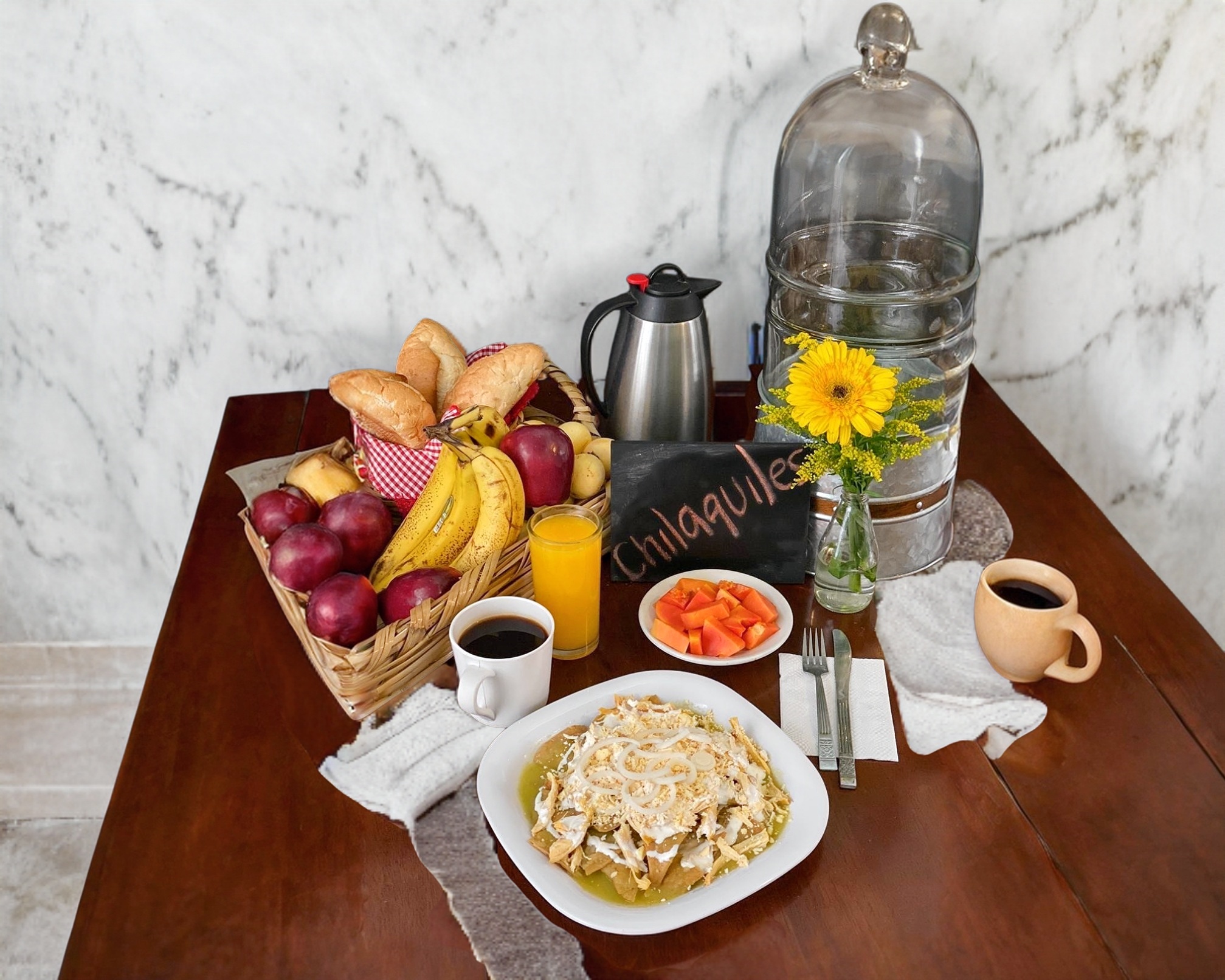 Fruta*1 + Jugo*1 + Chapata de pollo (Incluye jugo, fruta, café o té)*1 + Café*1