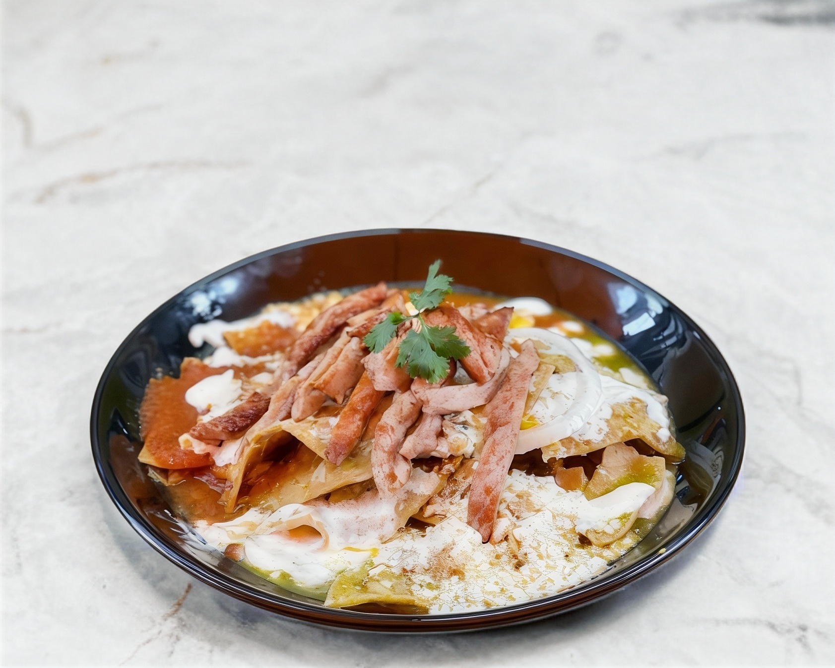 Deliciosos chilaquiles con carne al pastor, acompañados de queso rayado, crema, cebolla y un bolillito. Elige tu salsa preferida