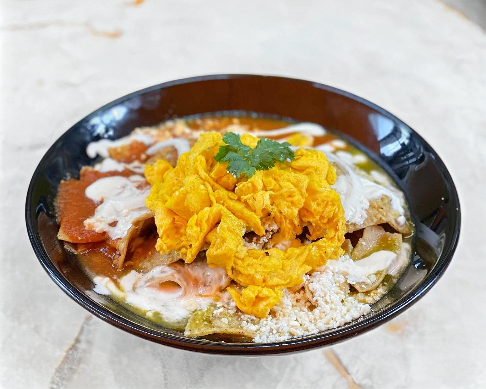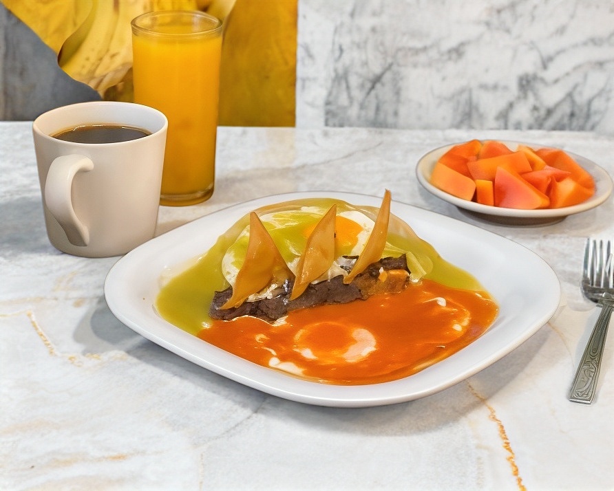 Deliciosos chilaquiles con 2 buebitos revueltos acompañados de queso rayado, crema, cebolla y un bolillito. Elige tu salsa preferida