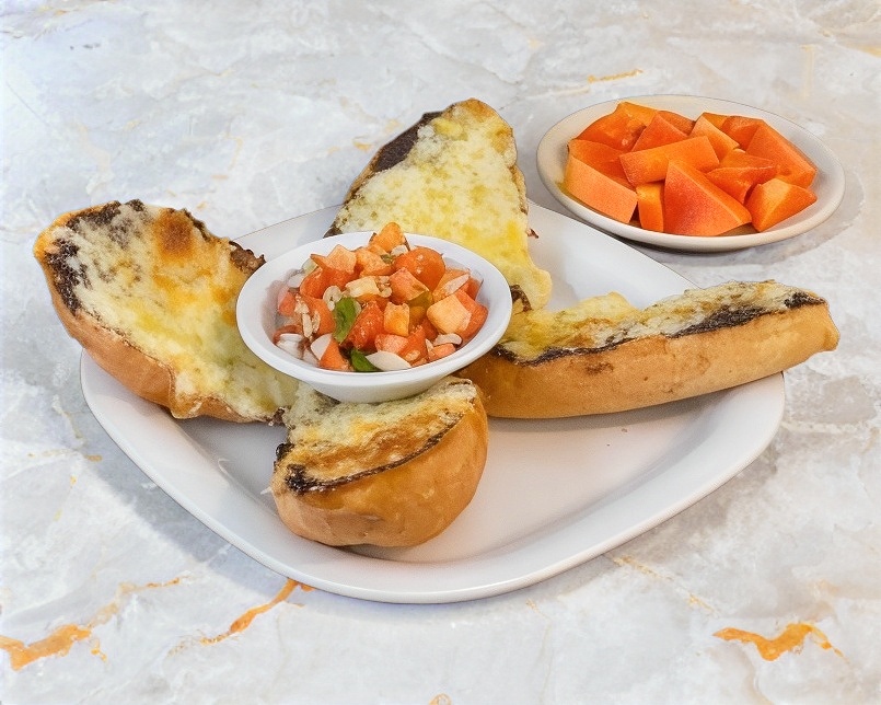 Deliciosos molletes (4) con frijolitos y un delicioso queso manchego de primera calidad y gratinado!! Acompañados de pico de gallo.