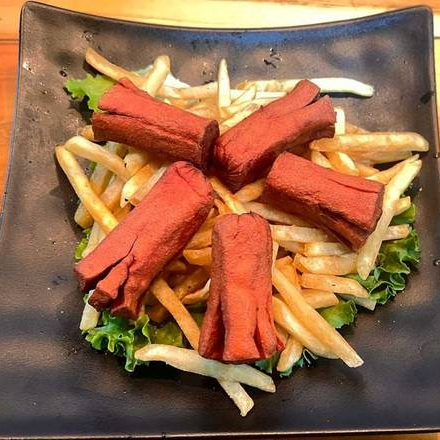 100 g De salchicha cortada en forma de pulpo, acompañada con 100 g de papas a la francesa.