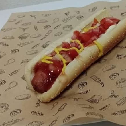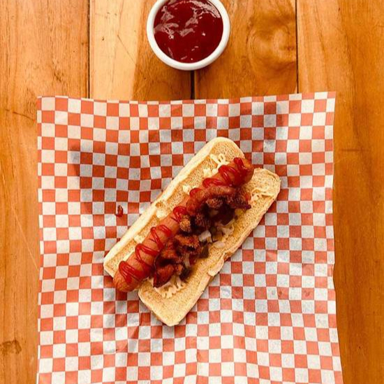 Hot dog con salchicha de 25 cm y tocino picado con mayonesa y cátsup.