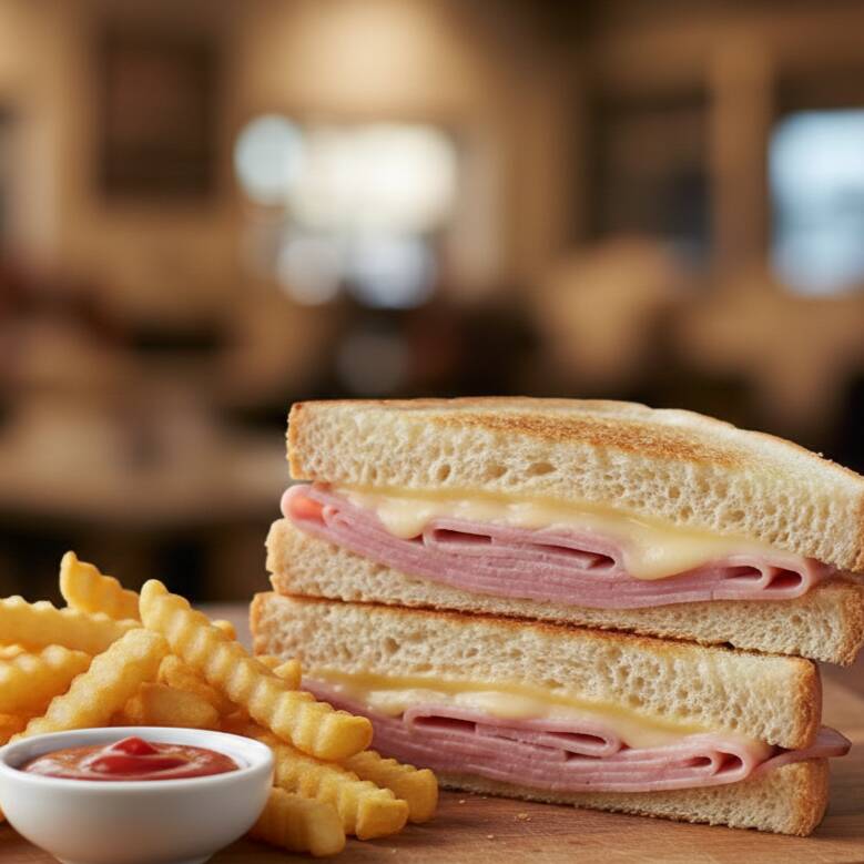Sandwich de jamón y queso acompañado de papas a la francesa.