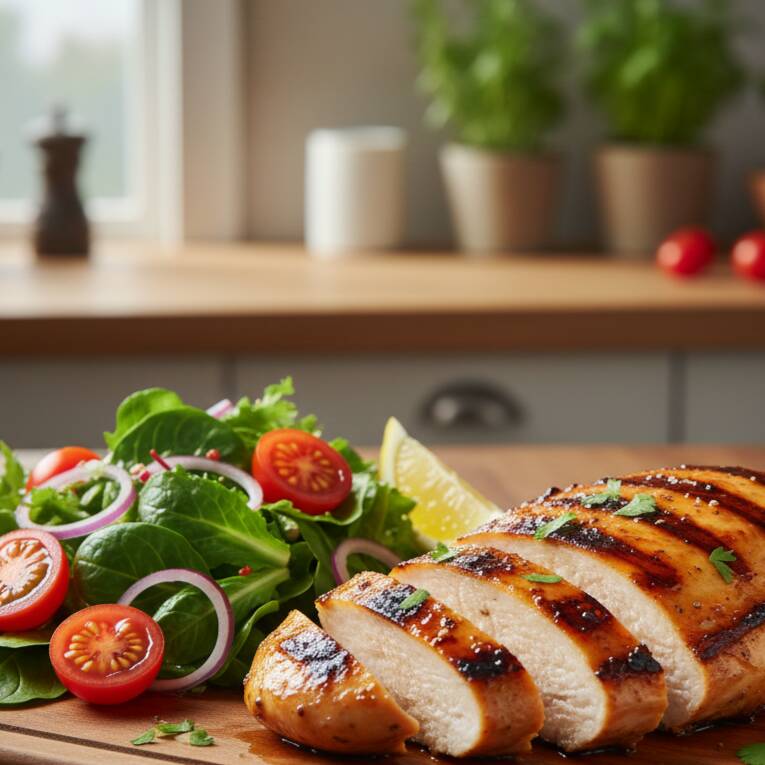 Pechuga asada acompañada de ensalada y salsa ranch