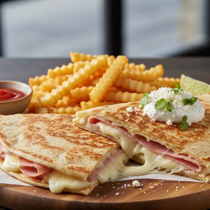 Sincronizada jumbo de jamón y queso acompañado de papas a la francesa.