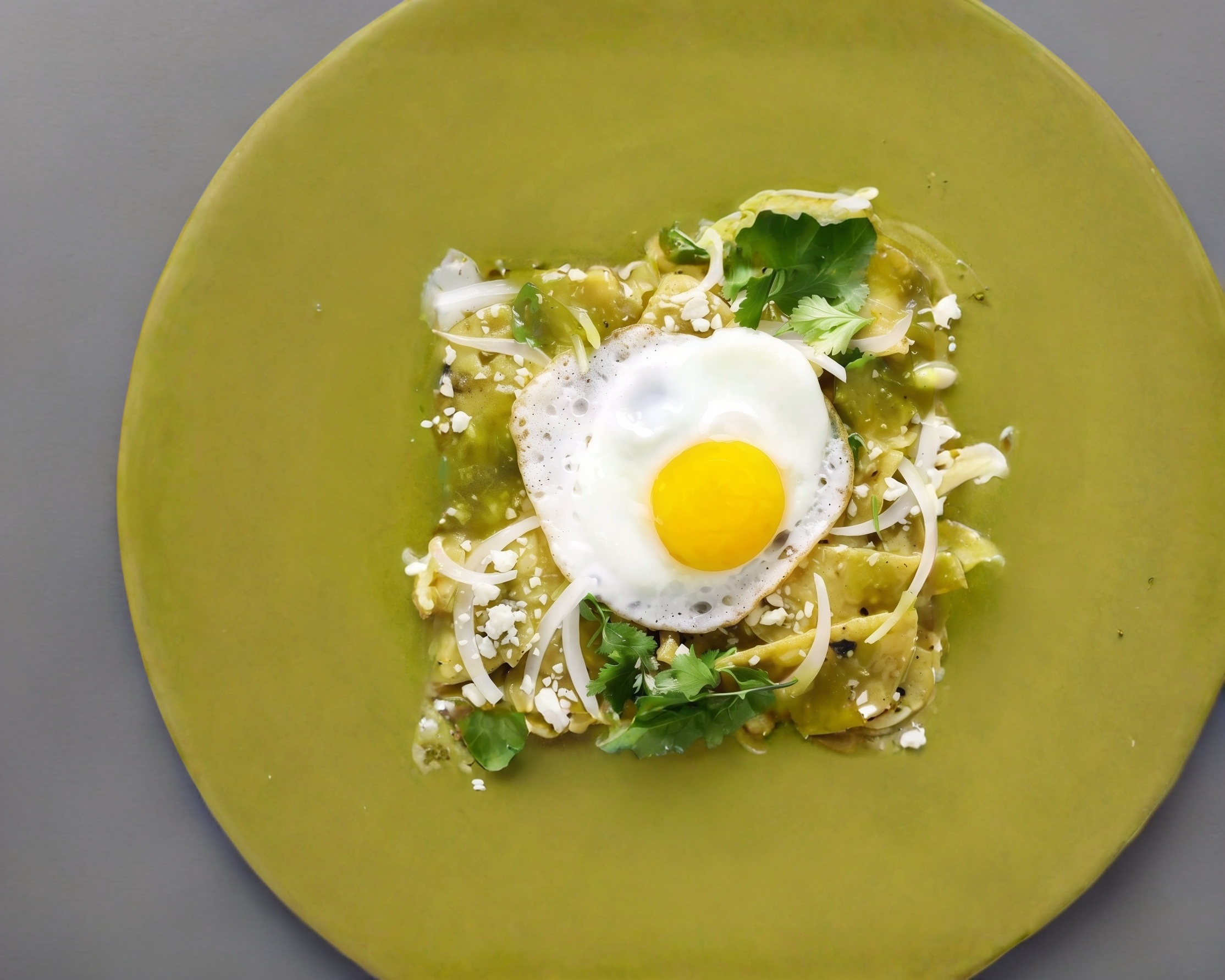 Huevo, crema, queso rallado, cebolla, totopos, salsa verde.