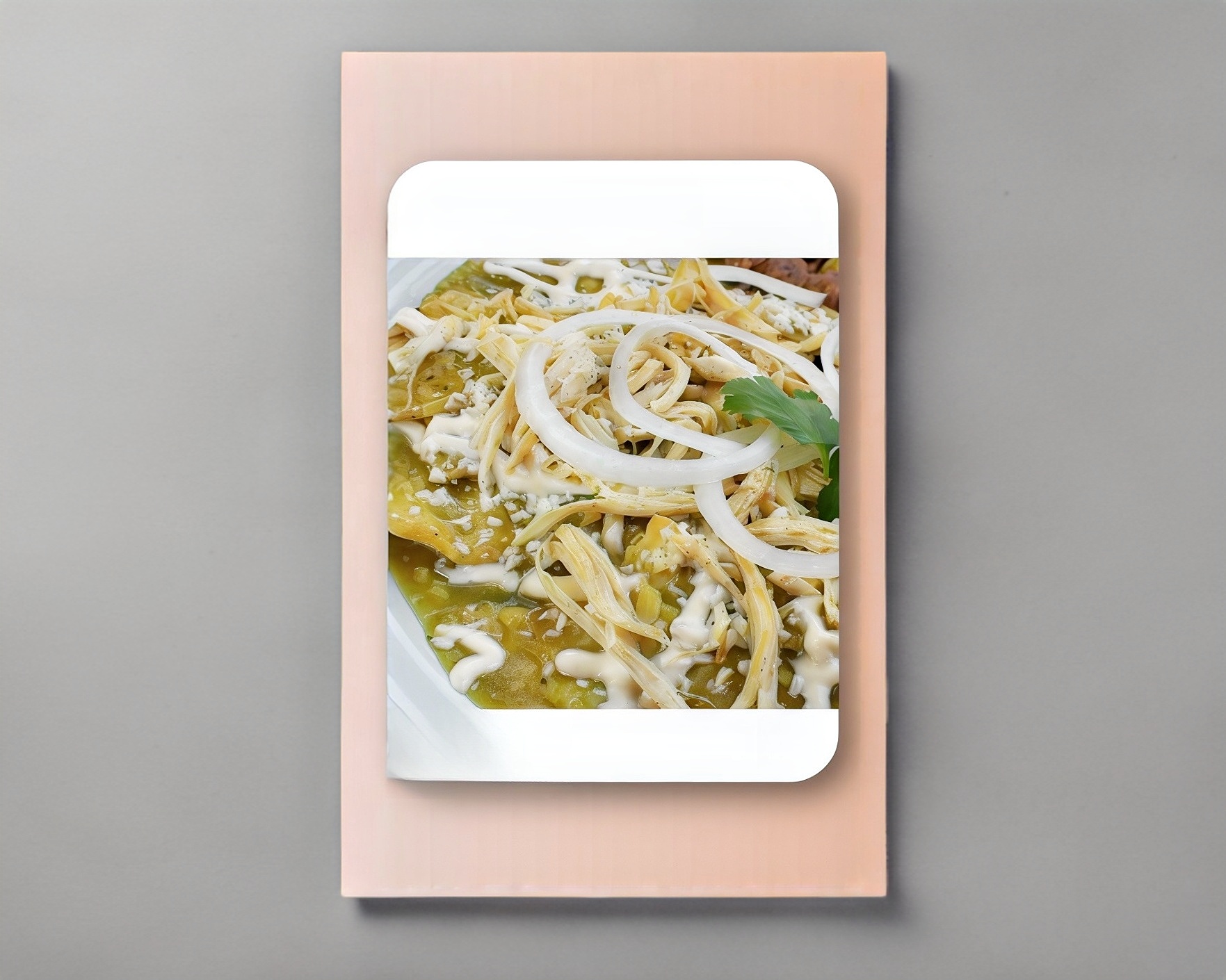 Totopos de maíz bañados en salsa en verde con pollo deshebrado, crema, queso rallado y cebolla, (Porción personal).