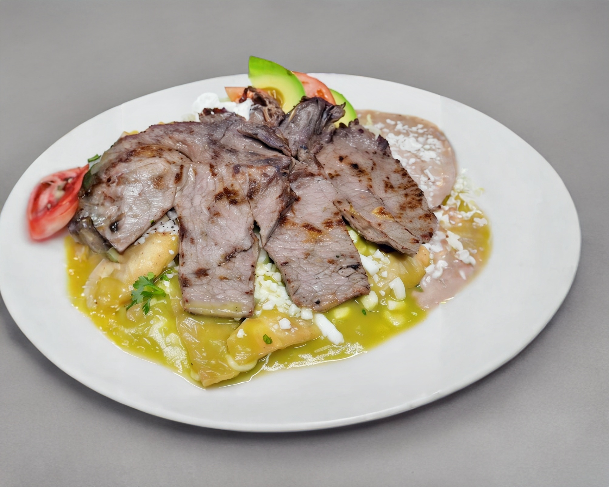 Totopos de maíz bañados en salsa en verde con bisteck de res, crema, queso rallado y cebolla, (Porción personal).