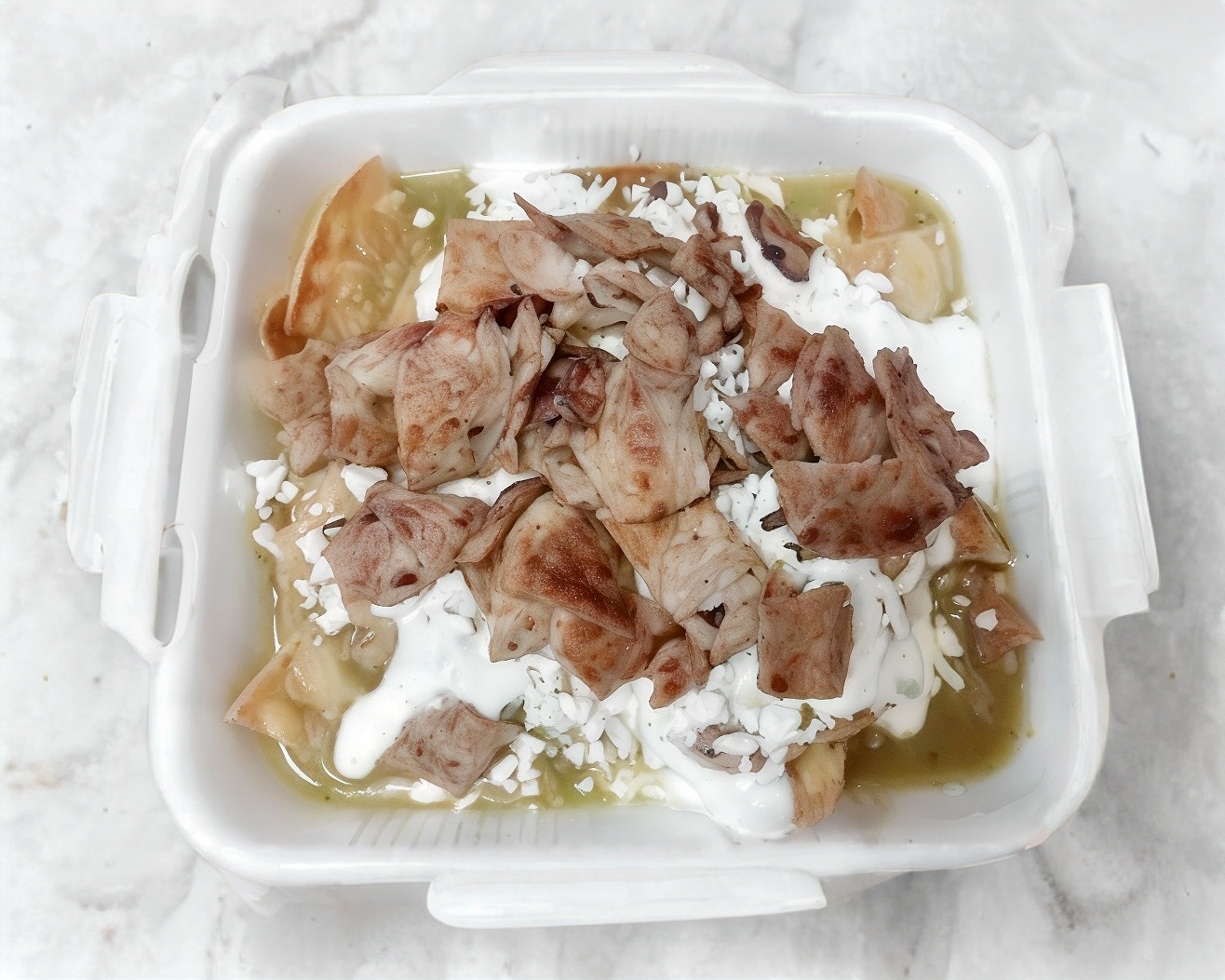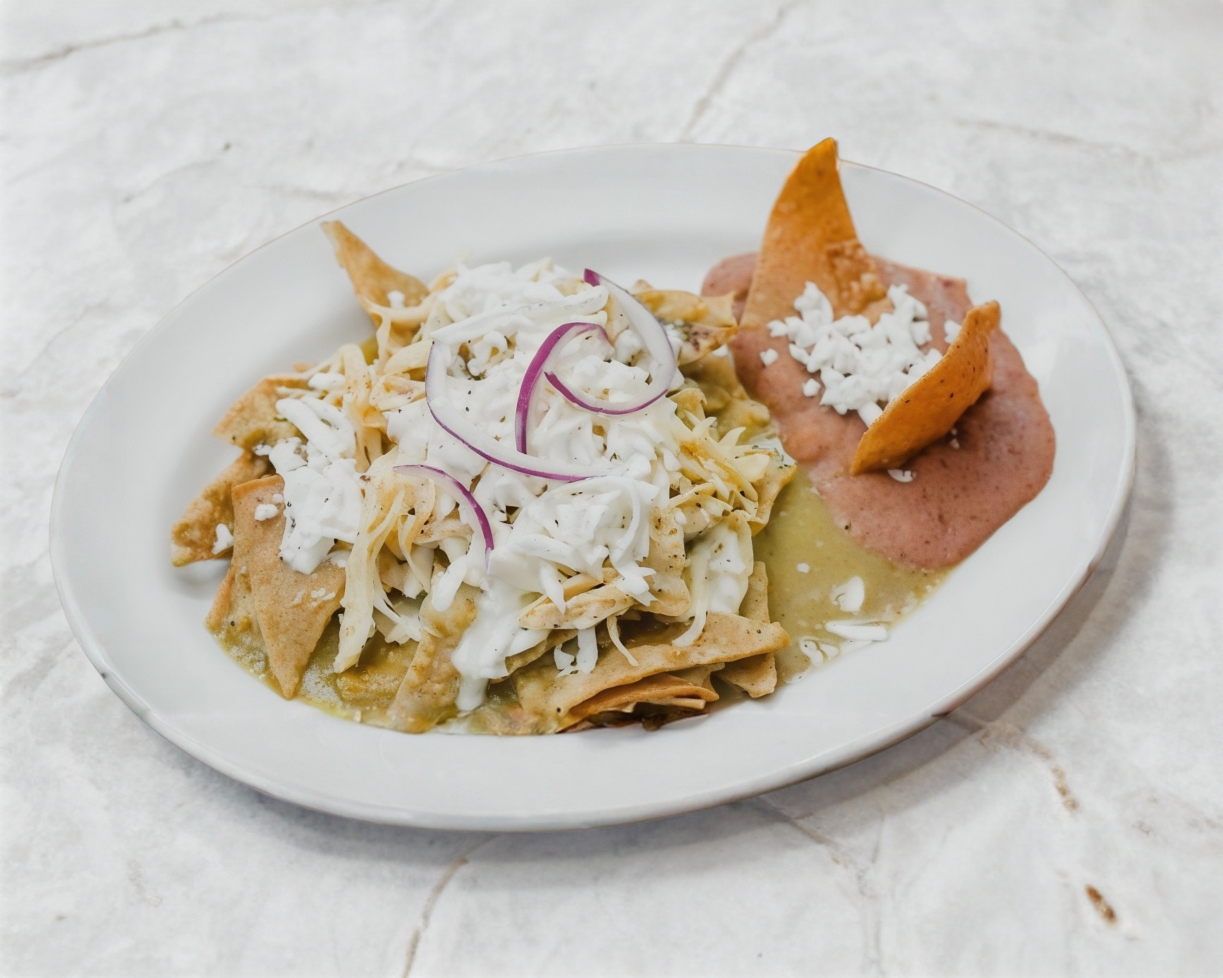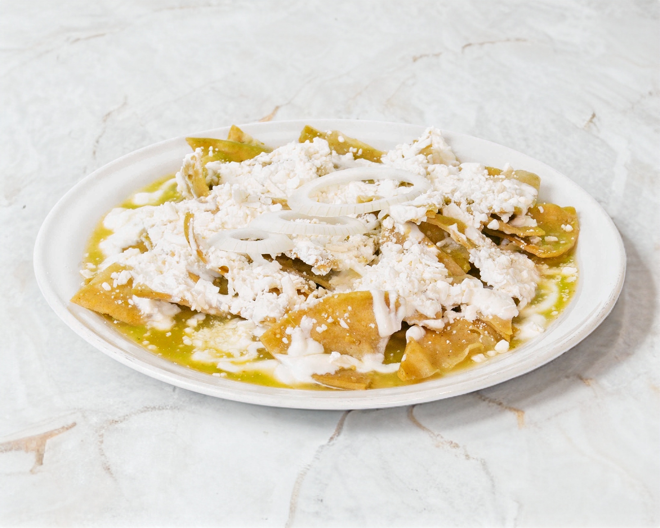 Chilaquiles con queso, crema y cebolla – 1 porción individual