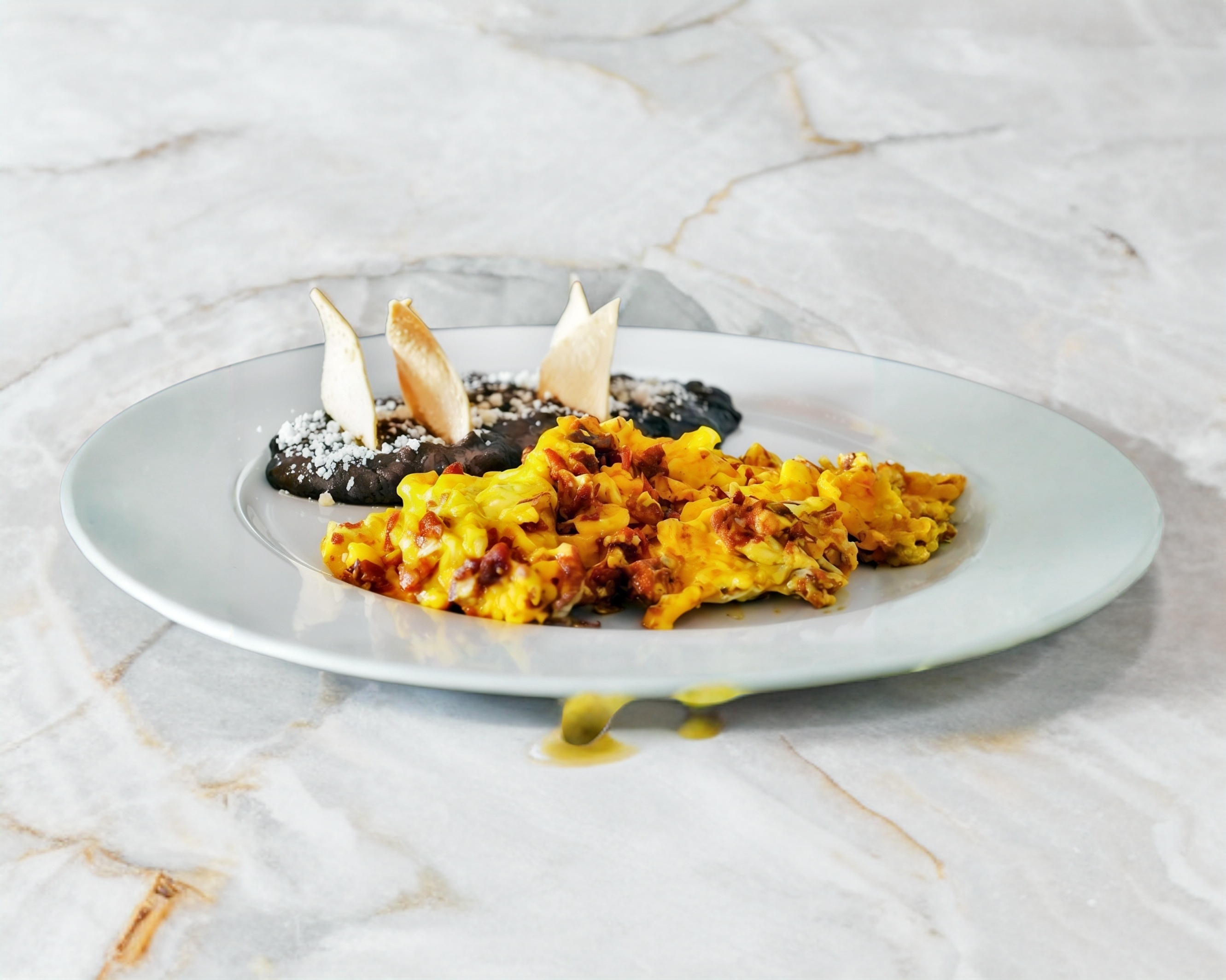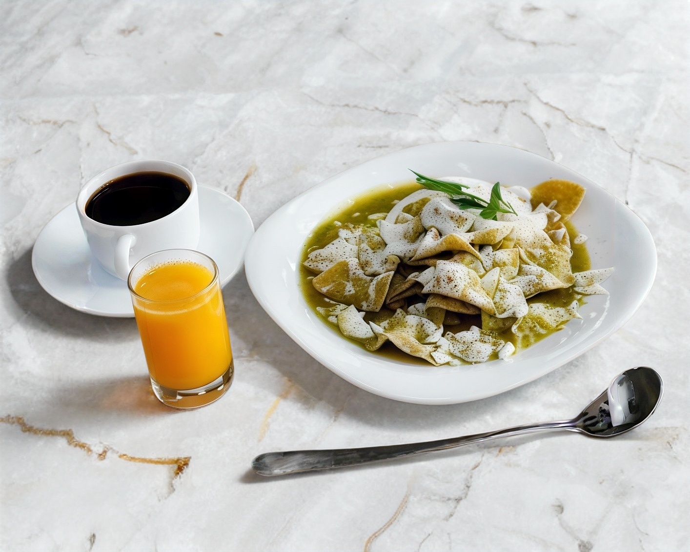 Chilaquiles con Bistec Crujientes chilaquiles acompañados de jugoso bistec, cubiertos con queso fresco, crema y cebolla.