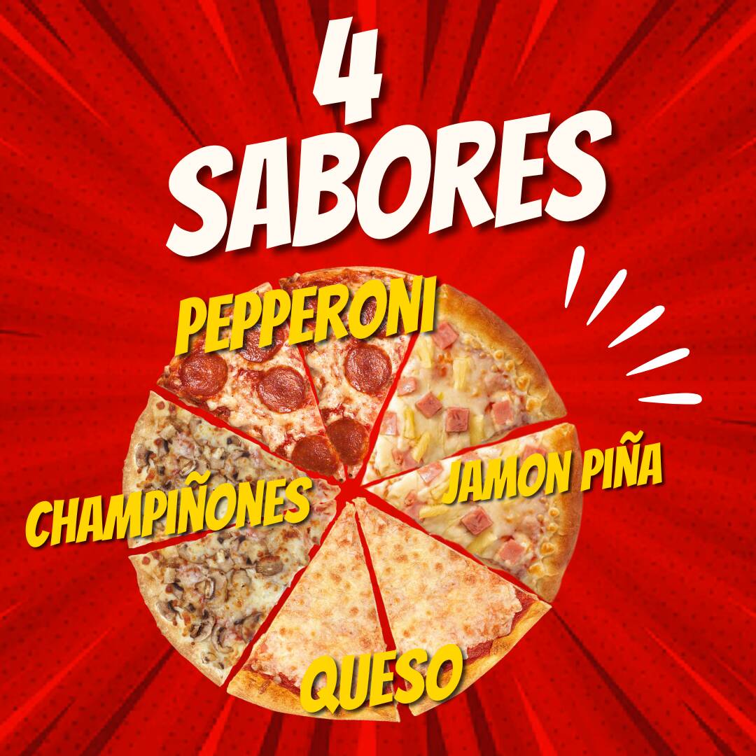 Combinación en masa original dividida en 4 deliciosos sabores: pepperoni, jamón con piña, queso y champiñones frescos.