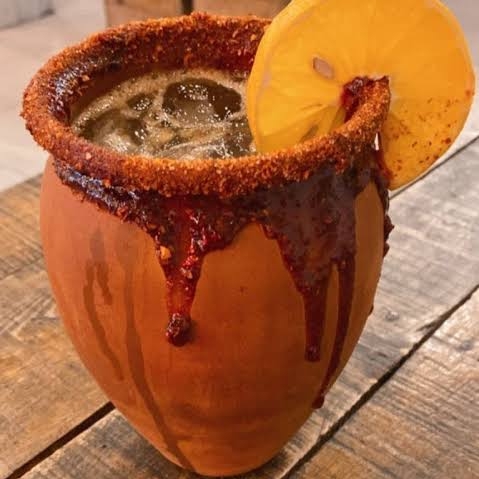 Tequila preparado con jugo de naranja servida en el tradiciomal cantarito de barro