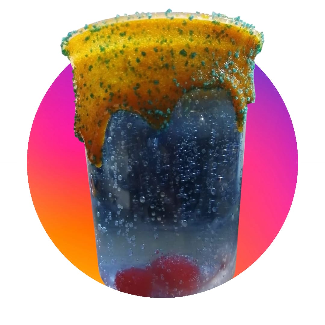 Vodka con refresco de limon y licor curacao, escarchado con chamoy de mora azul